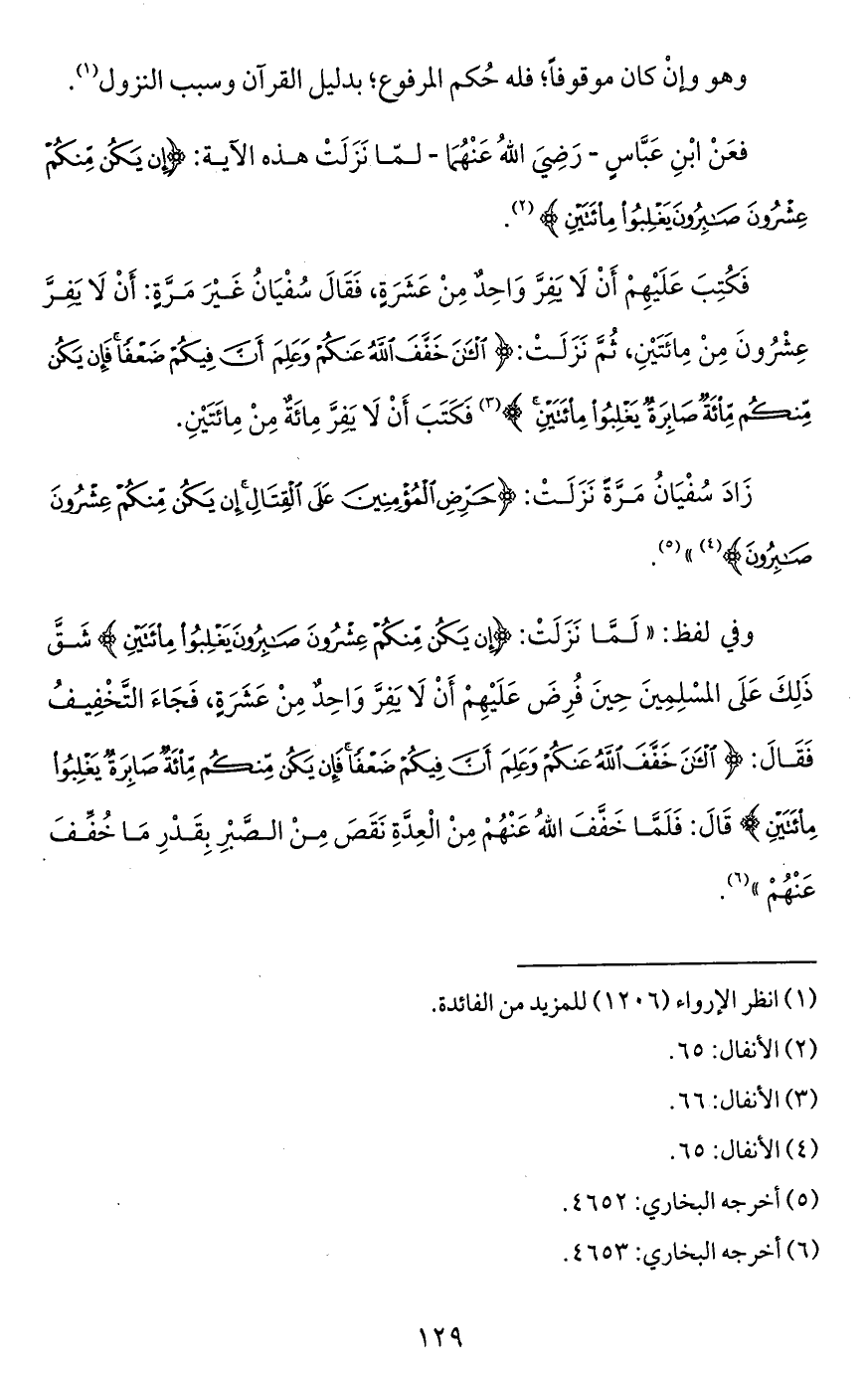 وفي لفظ: "لَمَّا نَزَلَتْ: {إِنْ يَكُنْ مِنْكُمْ عِشْرُونَ صَابِرُونَ يَغْلِبُوا مِائَتَيْنِ} شَقَّ ذَلِكَ عَلَى المسْلِمِينَ حِينَ فُرِضَ عَلَيْهِمْ أَنْ لَا يفِرَّ وَاحِدٌ مِنْ عَشَرَةِ، فَجَاءَ التَّخْفِيفُ فَقَالَ: {الْآنَ خَفَّفَ اللَّهُ عَنْكُمْ وَعَلِمَ أَنَّ فِيكُمْ ضَعْفًا فَإِنْ يَكُنْ مِنْكُمْ مِائَةٌ صَابِرَةٌ يَغْلِبُوا مِائَتَيْنِ} قَالَ: فَلَمَّا خَفَّفَ اللهُ عَنْهُمْ مِنْ الْعِدَّةِ نَقَصَ مِنْ الصَّبْرِ بِقَدْرِ مَا خُفِّفَ عَنْهُمْ" (¬6).