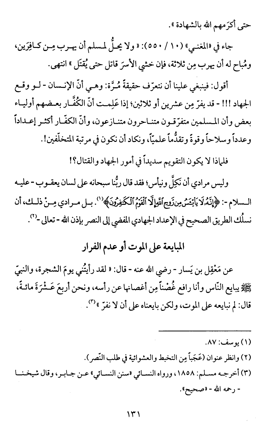 وليس مرادي أن نَكِلَّ ونيأس؛ فقد قال ربُّنا سبحانه على لسان يعقوب -عليه السلام-: {إِنَّهُ لَا يَيْأَسُ مِنْ رَوْحِ اللَّهِ إِلَّا الْقَوْمُ الْكَافِرُونَ} (¬1). بل مرادي مِنْ ذلك، أن نسلُك الطريق الصحيح في الإعداد الجهادي المفضي إلى النصر بإذن الله -تعالى- (¬2).