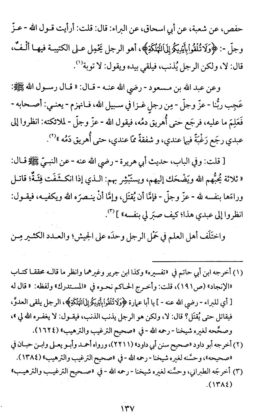 (¬1) أخرجه ابن أبي حاتم في "تفسيره" وكذا ابن جرير وغيرهما وانظر ما قاله محققا كتاب "الإنجاد" (ص 191)، قلت؛ وأخرج الحاكم نحوه في "المستدرك" ولفظه: "قال له [أي للبراء -رضي الله عنه-] يا أبا عمارة {وَلَا تُلْقُوا بِأَيْدِيكُمْ إِلَى التَّهْلُكَةِ}، الرجل يلقى العدوَّ، فيقاتل حتى يُقتَل؟ قال: لا، ولكن هو الرجل يذنب الذنب، فيقول: لا يغفره الله لي"، وصحَّحه لغيره شيخنا -رحمه الله- في "صحيح الترغيب والترهيب" (1624).