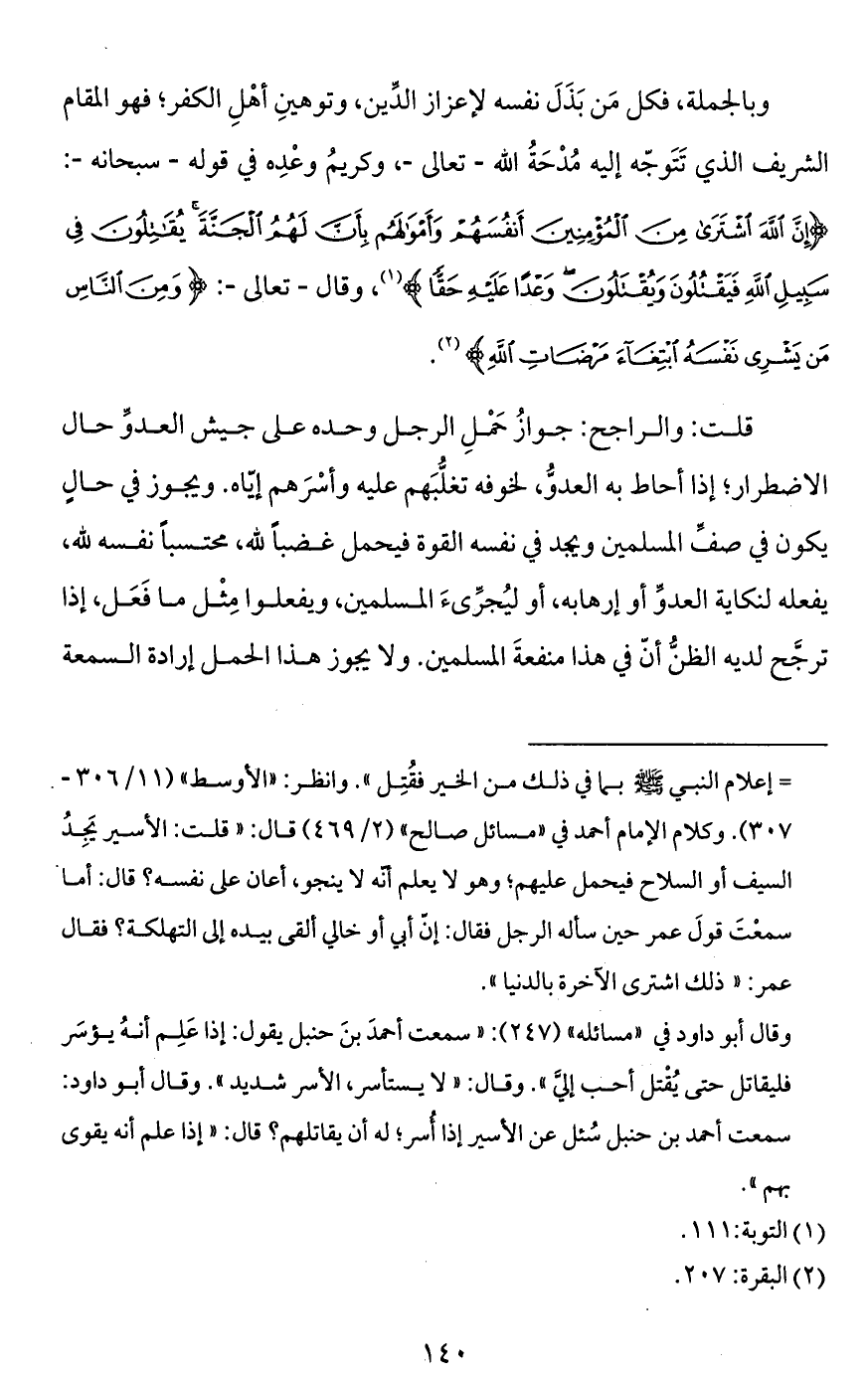 = إعلام النبي - صَلَّى اللَّهُ عَلَيْهِ وَسَلَّمَ - بما في ذلك من الخير فقُتِل". وانظر: "الأوسط" (11/ 306 - 307). وكلام الإمام أحمد في "مسائل صالح" (2/ 469) قال: "قلت: الأسير يَجِدُ السيف أو السلاح فيحمل عليهم؛ وهو لا يعلم أنّه لا ينجو، أعان على نفسه؟ قال: أما سمعْتَ قولَ عمر حين سأله الرجل فقال: إنّ أبي أو خالي ألقى بيده إلى التهلكة؟ فقال عمر: "ذلك اشترى الآخرة بالدنيا".