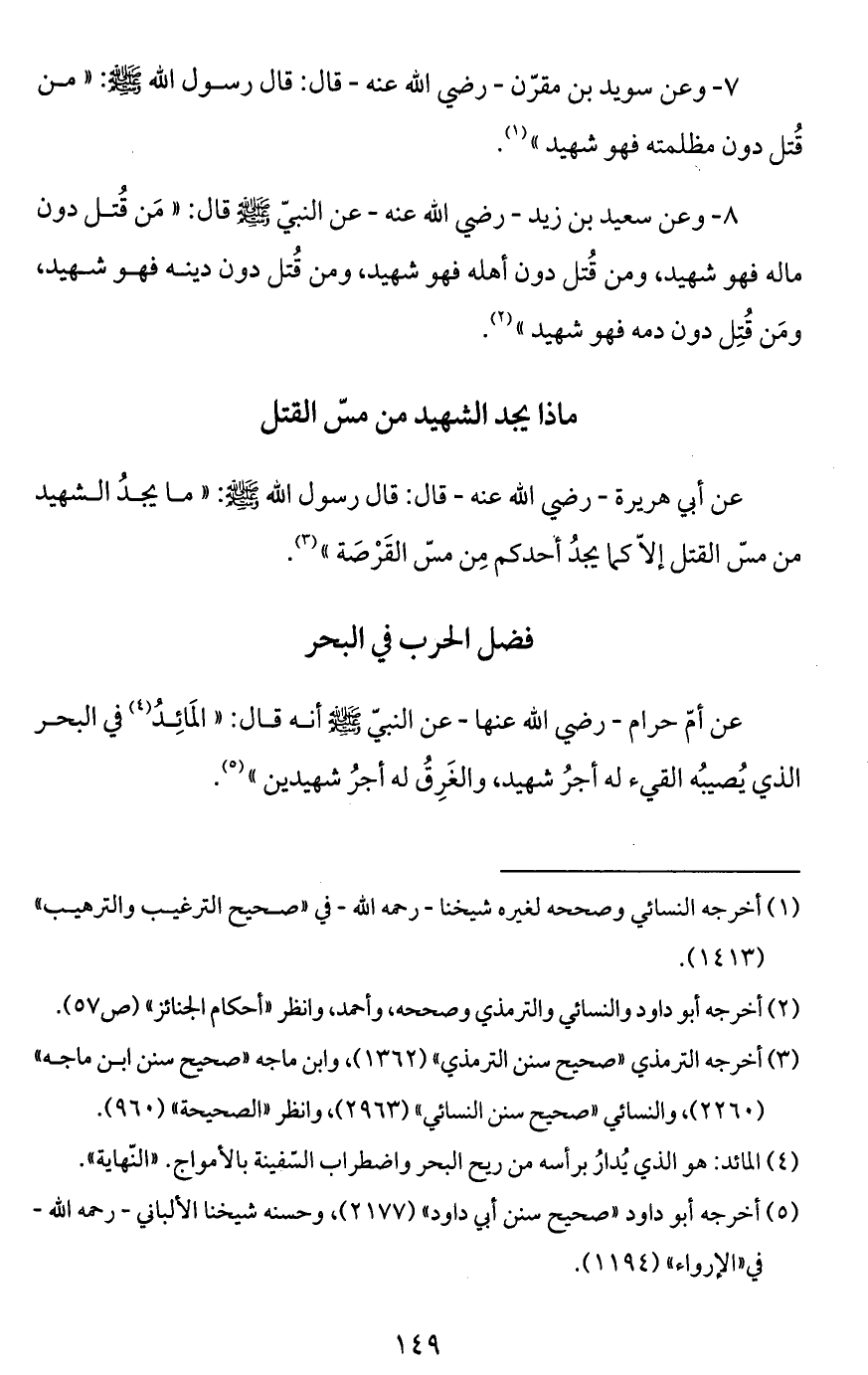 8 - وعن سعيد بن زيد -رضي الله عنه- عن النبيّ - صَلَّى اللَّهُ عَلَيْهِ وَسَلَّمَ - قال: "مَن قُتل دون ماله فهو شهيد، ومن قُتل دون أهله فهو شهيد، ومن قُتل دون دينه فهو شهيد، ومَن قُتِل دون دمه فهو شهيد" (¬2).