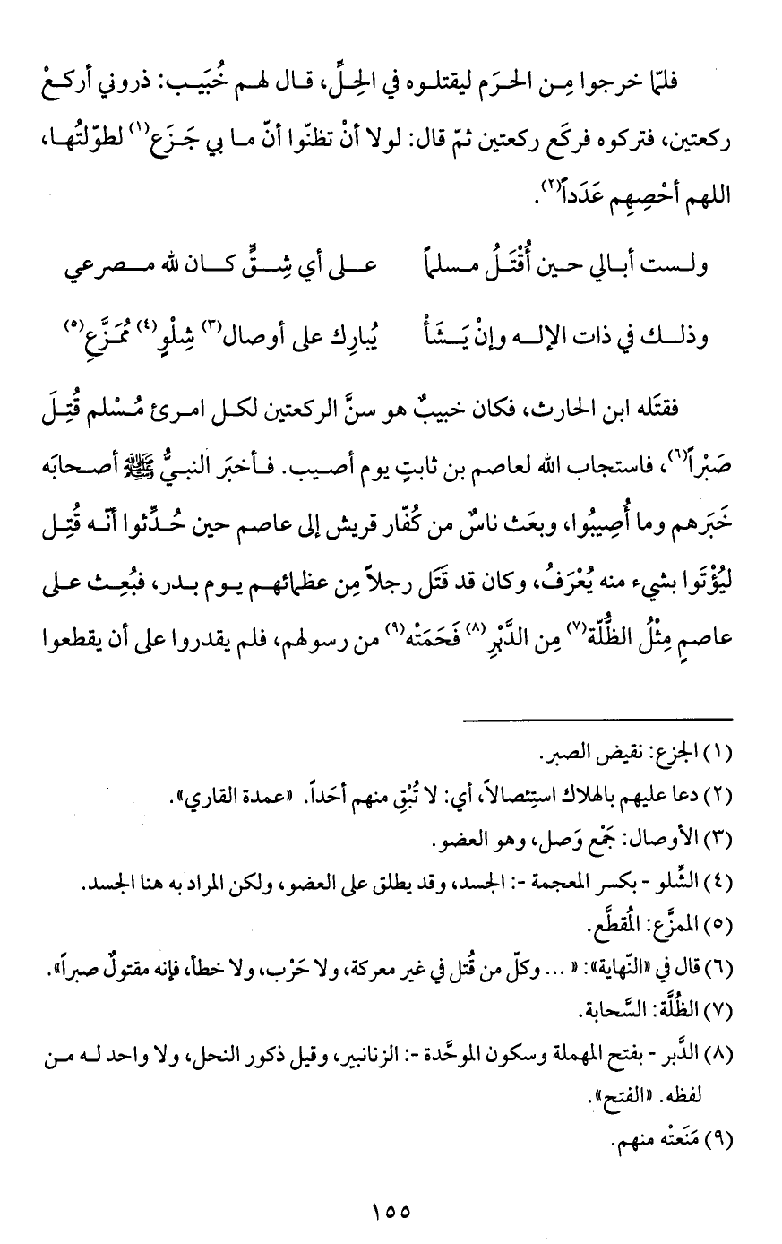 فقتَله ابن الحارث، فكان خبيبٌ هو سنَّ الركعتين لكل امرئ مُسْلم قُتِلَ صَبْراً (¬6)، فاستجاب الله لعاصم بن ثابتٍ يوم أصيب. فأخبَر النبيُّ - صَلَّى اللَّهُ عَلَيْهِ وَسَلَّمَ - أصحابَه خَبَرهم وما أُصِيبُوا، وبعَث ناسٌ من كُفّار قريش إلى عاصم حين حُدِّثوا أنّه قُتِل ليُؤْتَوا بشيء منه يُعْرَفُ، وكان قد قتل رجلاً مِن عظمائهم يوم بدر، فبُعِث على عاصمٍ مِثْلُ الظُّلّة (¬7) مِن الدَّبْرِ (¬8) فَحَمَتْه (¬9) من رسولهم، فلم يقدروا على أن يقطعوا