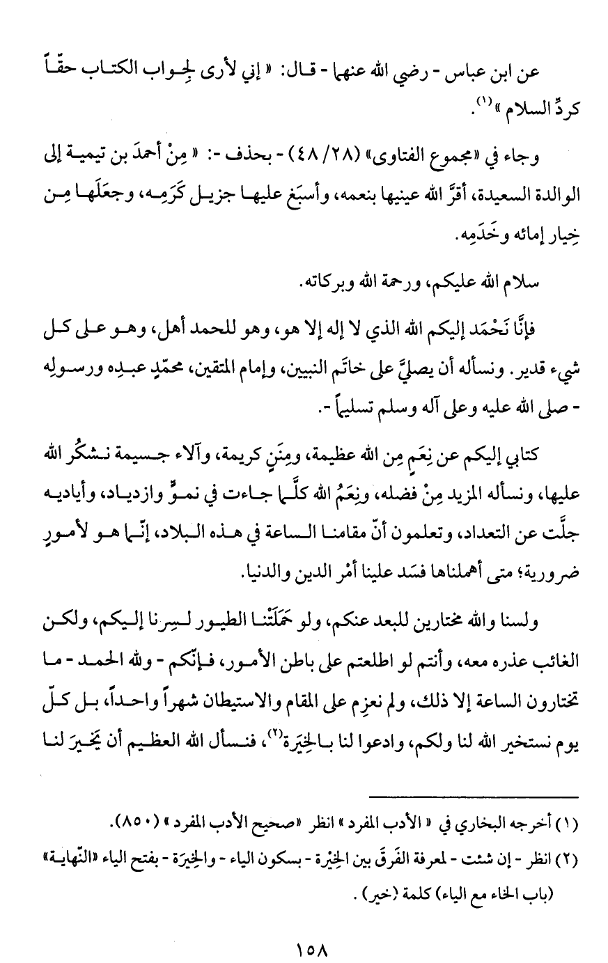 وجاء في "مجموع الفتاوى" (28/ 48) -بحذف-: "مِنْ أحمدَ بن تيمية إلى الوالدة السعيدة، أقرَّ الله عينيها بنعمه، وأسبَغ عليها جزيل كَرَمِه، وجعَلَها مِن خِيار إمائه وخَدَمِه.