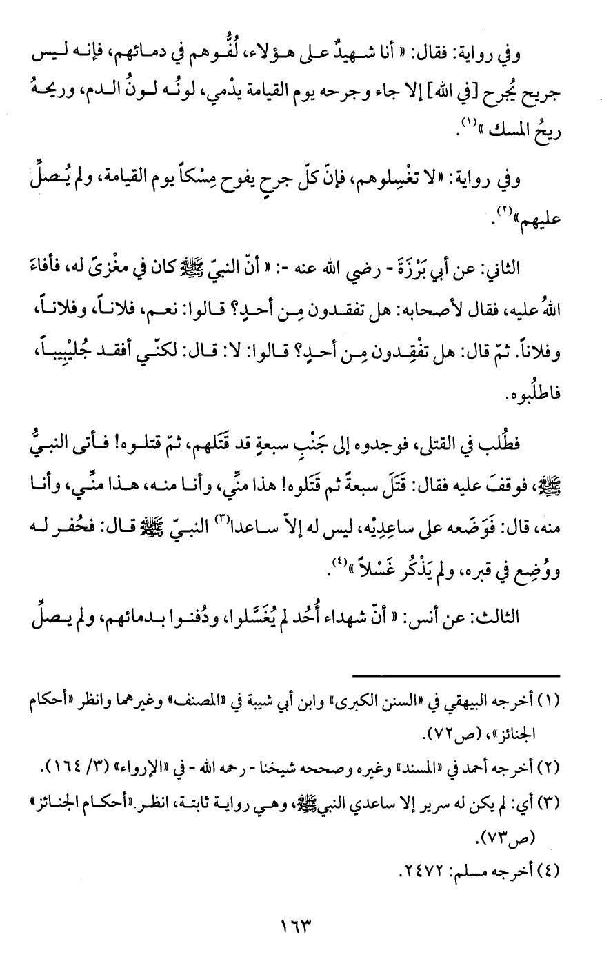 الثالث: عن أنس: "أنّ شهداء أُحُد لم يُغَسَّلوا، ودُفنوا بدمائهم، ولم يصلِّ