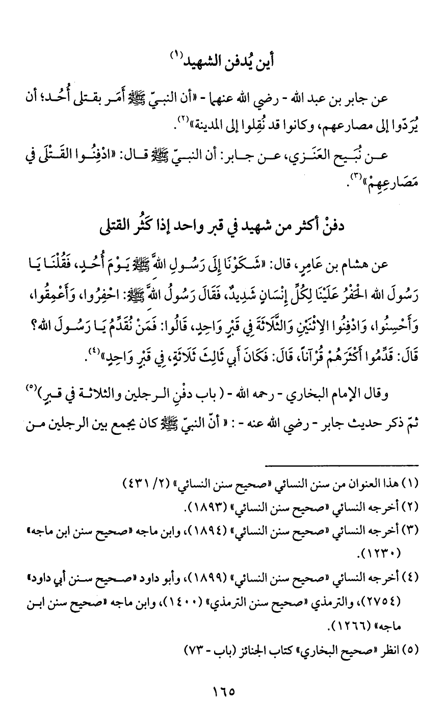 وقال الإمام البخاري -رحمه الله- (باب دفْنِ الرجلين والثلاثة في قبرٍ) (¬5) ثمّ ذكر حديث جابر -رضي الله عنه-: "أنّ النبيّ - صَلَّى اللَّهُ عَلَيْهِ وَسَلَّمَ - كان يجمع بين الرجلين من