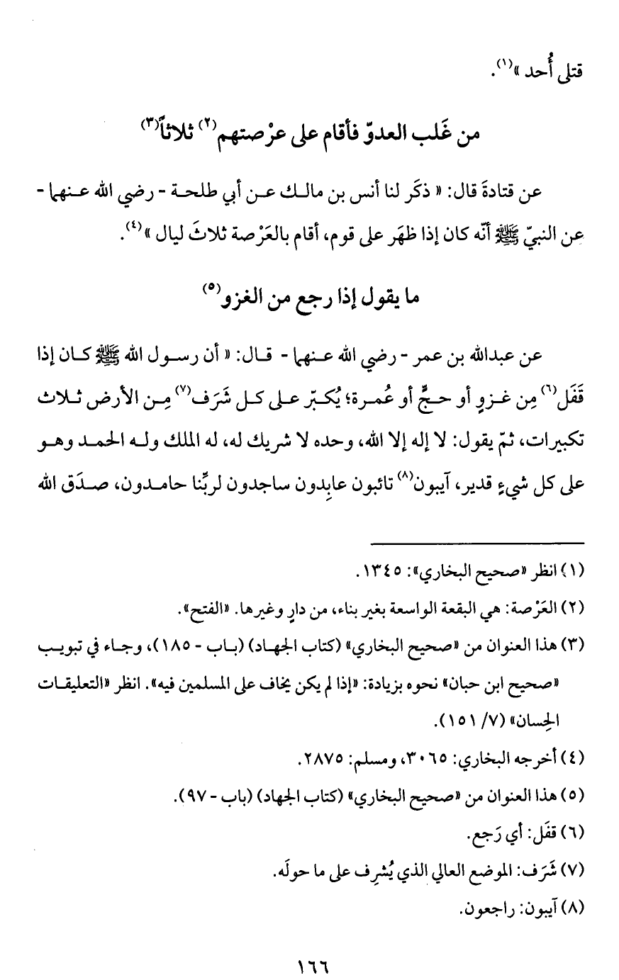 عن عبد الله بن عمر -رضي الله عنهما- قال: "أن رسول الله - صَلَّى اللَّهُ عَلَيْهِ وَسَلَّمَ - كان إذا قَفَل (¬6) مِن غزوٍ أو حجٍّ أو عُمرة؛ يُكبّر على كل شَرَف (¬7) مِن الأرض ثلاث تكبيرات، ثمّ يقول: لا إله إلاَّ الله، وحده لا شريك له، له الملك وله الحمد وهو على كل شيءٍ قدير، آيبون (¬8) تائبون عابِدون ساجدون لربنا حامدون، صدَق الله