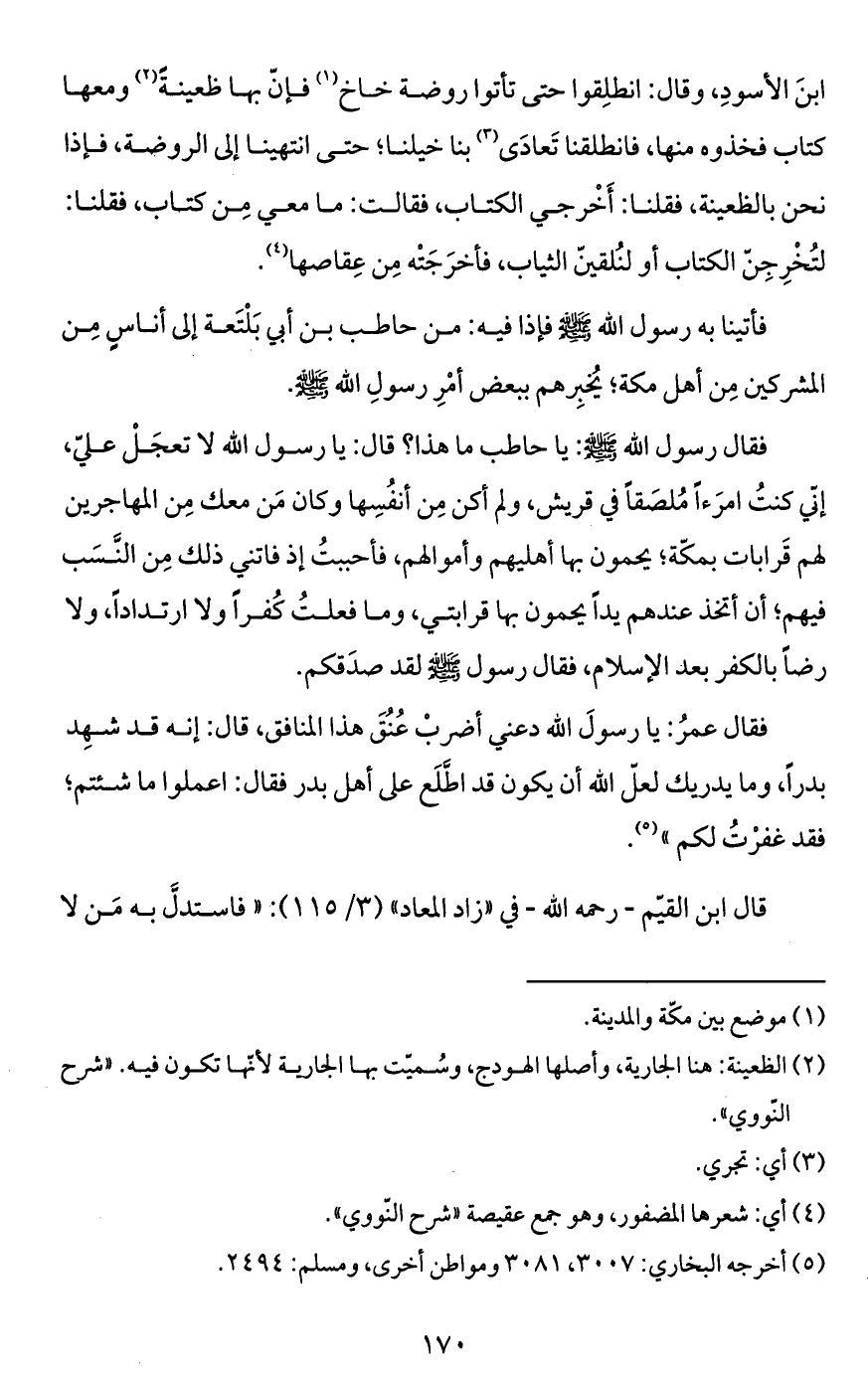 فقال رسول الله - صَلَّى اللَّهُ عَلَيْهِ وَسَلَّمَ -: يا حاطب ما هذا؟ قال: يا رسول الله لا تعجَلْ عليّ، إنّي كنتُ امرَءاً مُلصَقاً في قريش، ولم أكن مِن أنفُسِها وكان مَن معك مِن المهاجرين لهم قَرابات بمكّة؛ يحمون بها أهليهم وأموالهم، فأحببتُ إذ فاتني ذلك مِن النَّسَب فيهم؛ أن أتخذ عندهم يداً يحمون بها قرابتي، وما فعلتُ كُفراً ولا ارتداداً، ولا رضاً بالكفر بعد الإسلام، فقال رسول - صَلَّى اللَّهُ عَلَيْهِ وَسَلَّمَ - لقد صدَقكم.