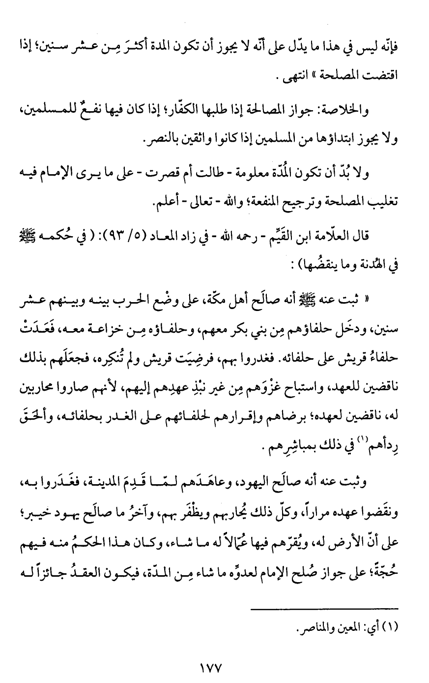 قال العلاّمة ابن القَيِّم -رحمه الله- في زاد المعاد (5/ 93): (في حُكمه - صَلَّى اللَّهُ عَلَيْهِ وَسَلَّمَ - في الهُدنة وما ينقضُها):