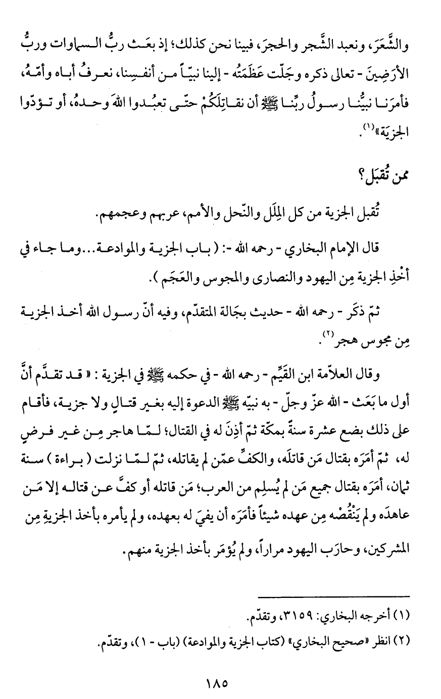 وقال العلاّمة ابن القَيِّم -رحمه الله- في حكمه - صَلَّى اللَّهُ عَلَيْهِ وَسَلَّمَ - في الجزية: "قد تقدَّم أنَّ أول ما بَعَث -الله عزّ وجلّ- به نبيّه - صَلَّى اللَّهُ عَلَيْهِ وَسَلَّمَ - الدعوة إليه بغير قتالٍ ولا جزية، فأقام على ذلك بضع عشرة سنةً بمكّة ثمّ أذِنَ له في القتال؛ لمّا هاجر مِن غير فرضٍ له، ثمّ أمَرَه بقتال مَن قاتلَه، والكفِّ عمّن لم يقاتله، ثمّ لمّا نزلت (براءة) سنة ثمان، أمَرَه بقتال جميع مَن لم يُسلِم من العرب؛ مَن قاتله أو كفَّ عن قتاله إلاَّ مَن عاهدَه ولم يَنْقُصْه مِن عهده شيئاً فأمَرَه أن يفيَ له بعهده، ولم يأمره بأخذ الجزيةِ مِن المشركين، وحارَب اليهود مراراً، ولم يُؤمَر بأخذ الجزية منهم.