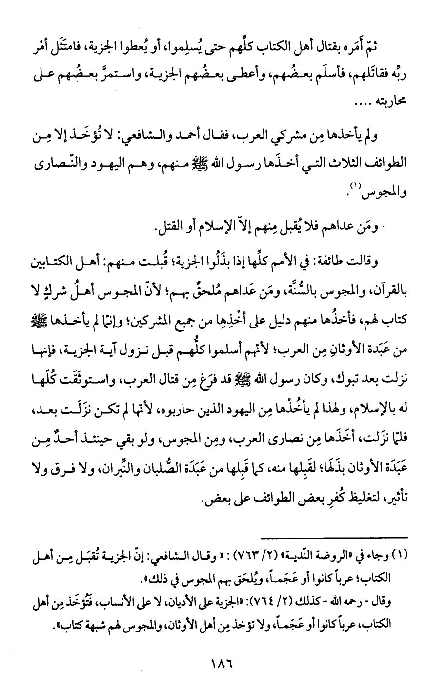 وقال -رحمه الله- كذلك (2/ 764): "الجزية على الأديان، لا على الأنساب، فتُؤخَذ مِن أهل الكتاب، عرباً كانوا أو عَجَماً، ولا تؤخذ مِن أهل الأوثان، والمجوس لهم شبهة كتاب".