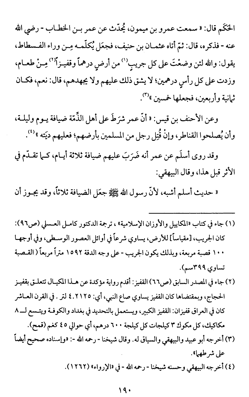 (¬2) جاء في المصدر السابق (ص 66) القفيز: أقدم رواية مؤكدة عن هذا المكيال تتعلق بقفيز الحجاج، وبمقتضاها كان القفيز يساوي صاع النبيّ، أي: 4.2125 لتر. في القرن العاشر كان في العراق قفيزان: القفيز الكبير، ويستعمل بالتحديد في بغداد والكوفة ويتسع لـ 8 مكاكيك، كل مكوك 3 كيلجات كل كيلجة 600 درهم، أي حوالي 45 كغم (قمح).