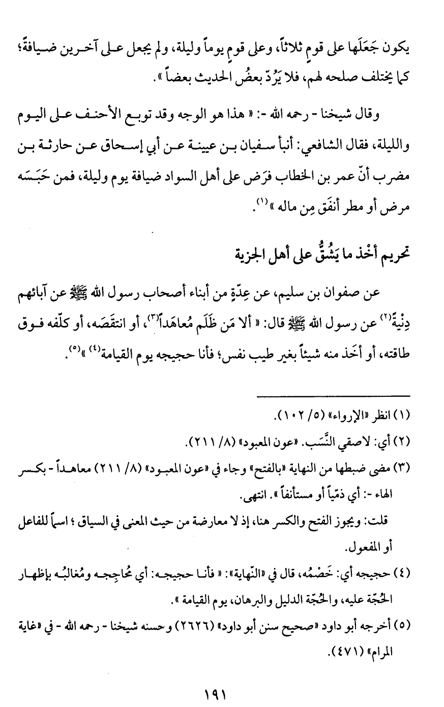 عن صفوان بن سليم، عن عِدّةٍ من أبناء أصحاب رسول الله - صَلَّى اللَّهُ عَلَيْهِ وَسَلَّمَ - عن آبائهم دِنْيةً (¬2) عن رسول الله - صَلَّى اللَّهُ عَلَيْهِ وَسَلَّمَ - قال: "ألا مَن ظلم مُعاهَداً (¬3)، أو انتقصَه، أو كلّفه فوق طاقته، أو أخَذ منه شيئاً بغير طيب نفس؛ فأنا حجيجه يوم القيامة (¬4) " (¬5).