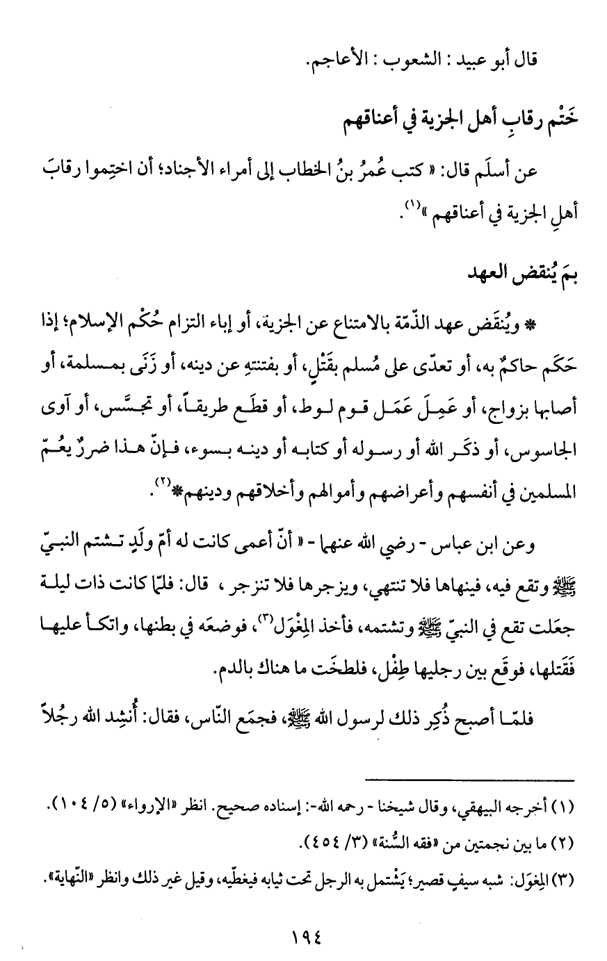 *ويُنقَض عهد الذّمّة بالامتناع عن الجزية، أو إباء التزام حُكْم الإسلام؛ إذا