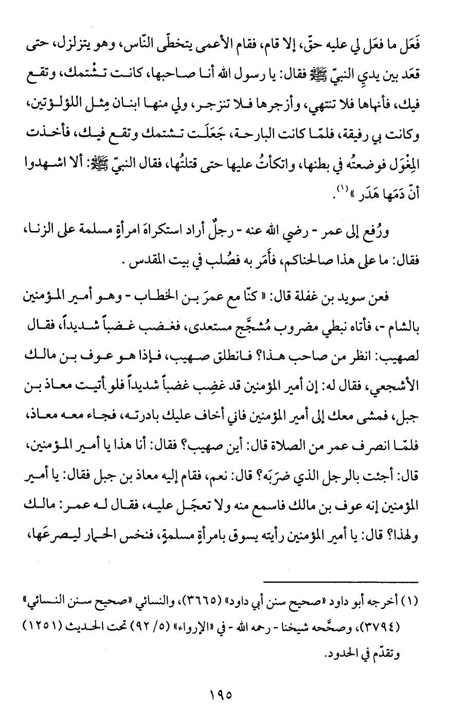 فلمّا انصرف عمر من الصلاة قال: أين صهيب؟ فقال: أنا هذا يا أمير المؤمنين، قال: أجئت بالرجل الذي ضرَبَه؟ قال: نعم، فقام إليه معاذ بن جبل فقال: يا أمير المؤمنين إنه عوف بن مالك فاسمع منه ولا تعجَل عليه، فقال له عمر: مالك ولهذا؟ قال: يا أمير المؤمنين رأيته يسوق بامرأةٍ مسلمةٍ، فنخس الحمار ليصرعَها،