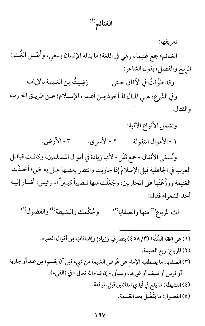 وتُسمّى الأنفال -جمع نَفَل- لأنها زيادة في أموال المسلمين، وكانت قبائل العرب في الجاهلية قبل الإسلام إذا حاربت وانتصر بعضها على بعض؛ أخذَت الغنيمة ووزَّعَتْها على المحاربين، وجَعَلَت منها نصيباً كبيراً للرئيس: أشار إليه أحد الشعراء فقال: