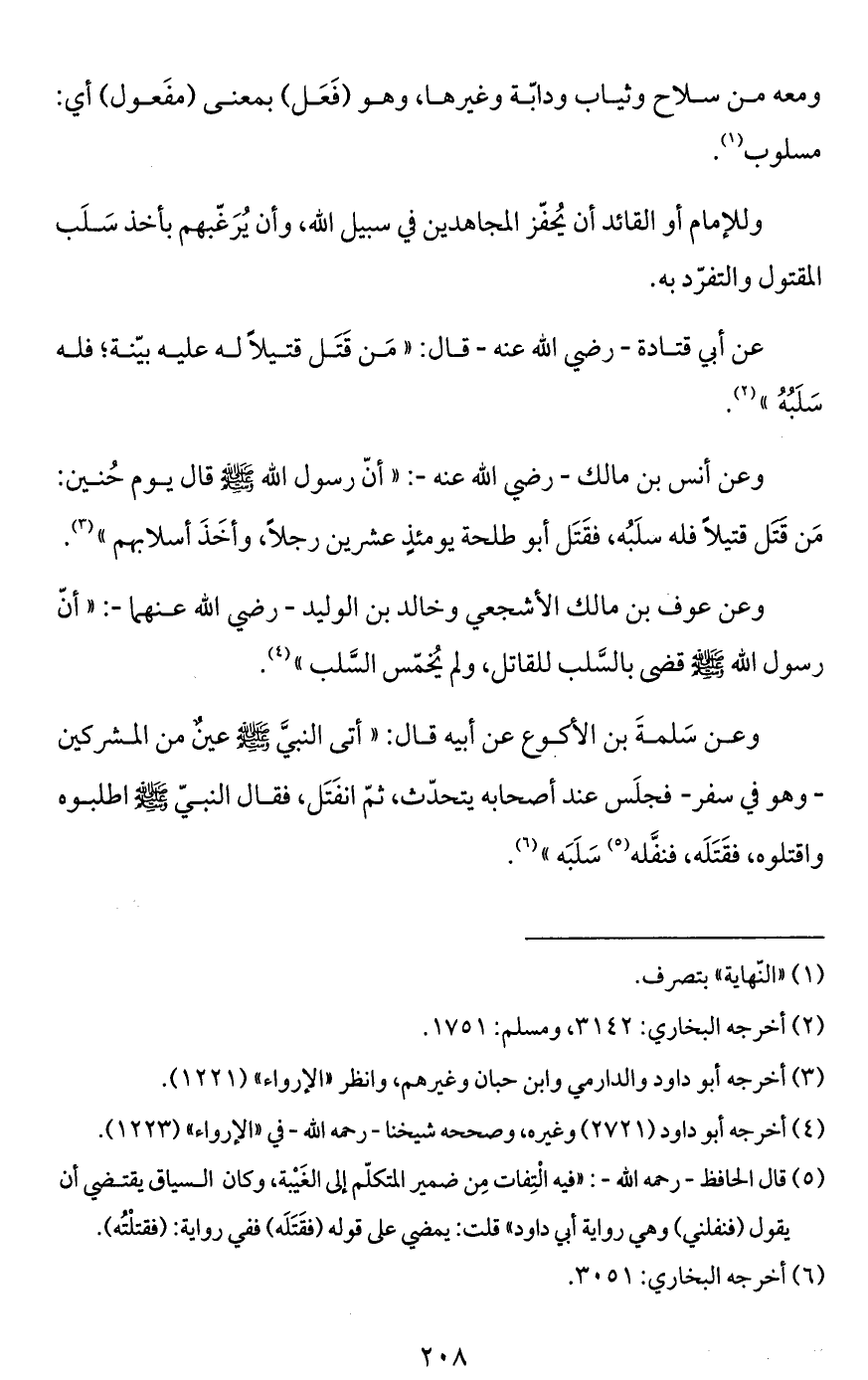 (¬5) قال الحافظ -رحمه الله-: "فيه الْتِفات مِن ضمير المتكلّم إلى الغَيْبة، وكان السياق يقتضي أن يقول (فنفلني) وهي رواية أبي داود" قلت: يمضي على قوله (فقَتَلَه) ففي رواية: (فقتلْتُه).