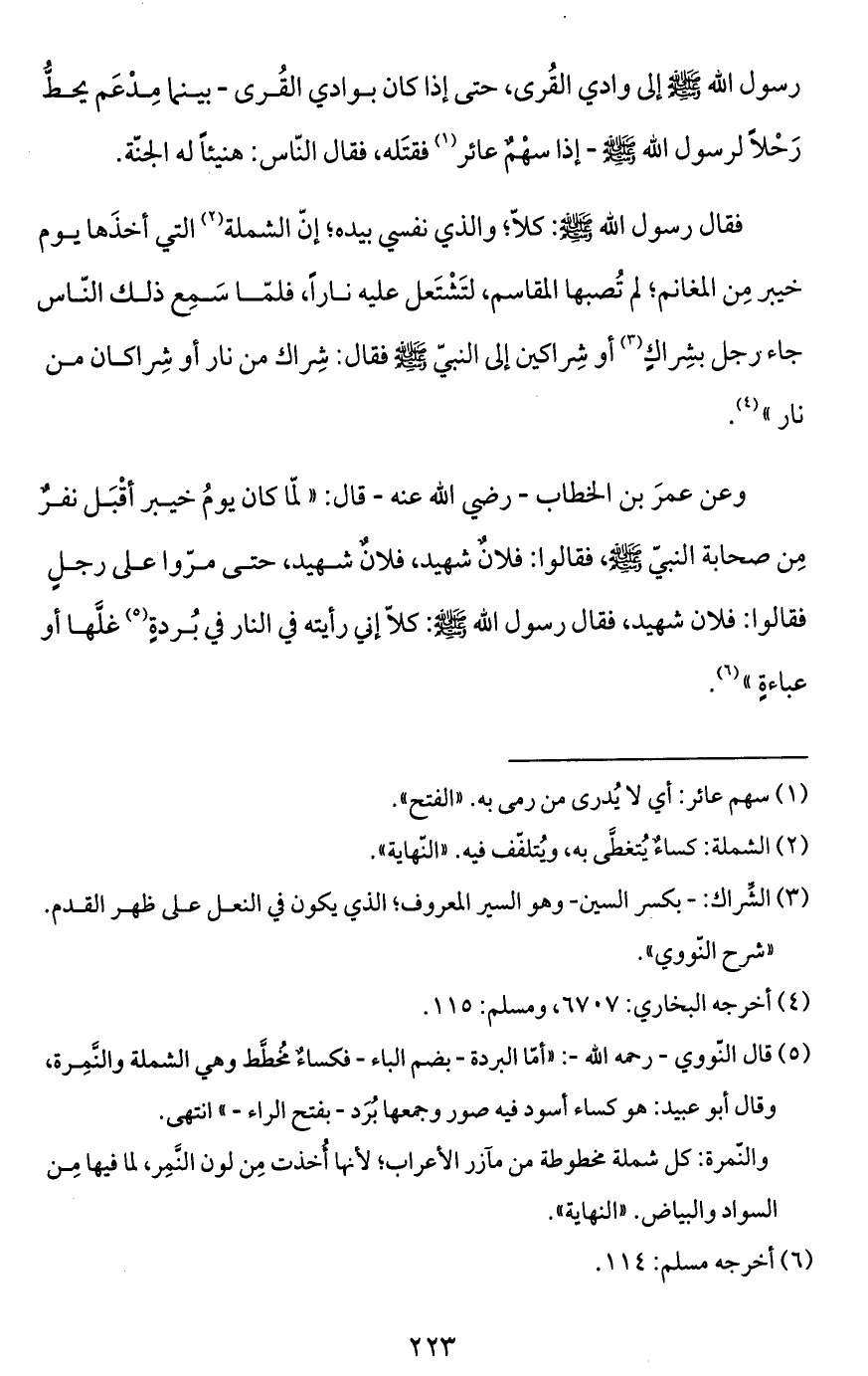 وعن عمرَ بن الخطاب -رضي الله عنه- قال: "لمّا كان يومُ خيبر أقْبَل نفرٌ مِن صحابة النبيّ - صَلَّى اللَّهُ عَلَيْهِ وَسَلَّمَ -، فقالوا: فلانٌ شهيد، فلانٌ شهيد، حتى مرّوا على رجلٍ فقالوا: فلان شهيد، فقال رسول الله - صَلَّى اللَّهُ عَلَيْهِ وَسَلَّمَ -: كلاّ إني رأيته في النار في بُردةٍ (¬5) غلَّها أو عباءةٍ" (¬6).