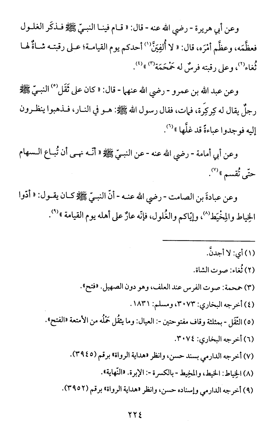 وعن أبي هريرة -رضي الله عنه- قال: "قام فينا النبيّ - صَلَّى اللَّهُ عَلَيْهِ وَسَلَّمَ - فذكَر الغلول فعظَّمَه، وعظَّم أمْرَه، قال: "لا أُلفِيَنَّ (¬1) أحدكم يوم القيامة؛ على رقبته شاةٌ لها ثُغاء (¬2)، وعلى رقبته فرسٌ له حَمْحَمَة (¬3) " (¬4).