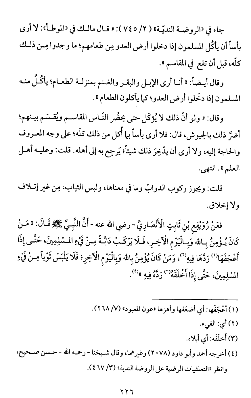 وقال: "ولو أنّ ذلك لا يُؤكَل حتى يحضُر النّاس المقاسم ويُقسَم بينهم؛ أضرَّ ذلك بالجيوش، قال: فلا أرى بأساً بما أُكل من ذلك كلّه؛ على وجه المعروف والحاجة إليه، ولا أرى أن يدّخِرَ ذلك شيئاً؛ يَرجِع به إلى أهله. قلت: وعليه أهل العلم". انتهى.