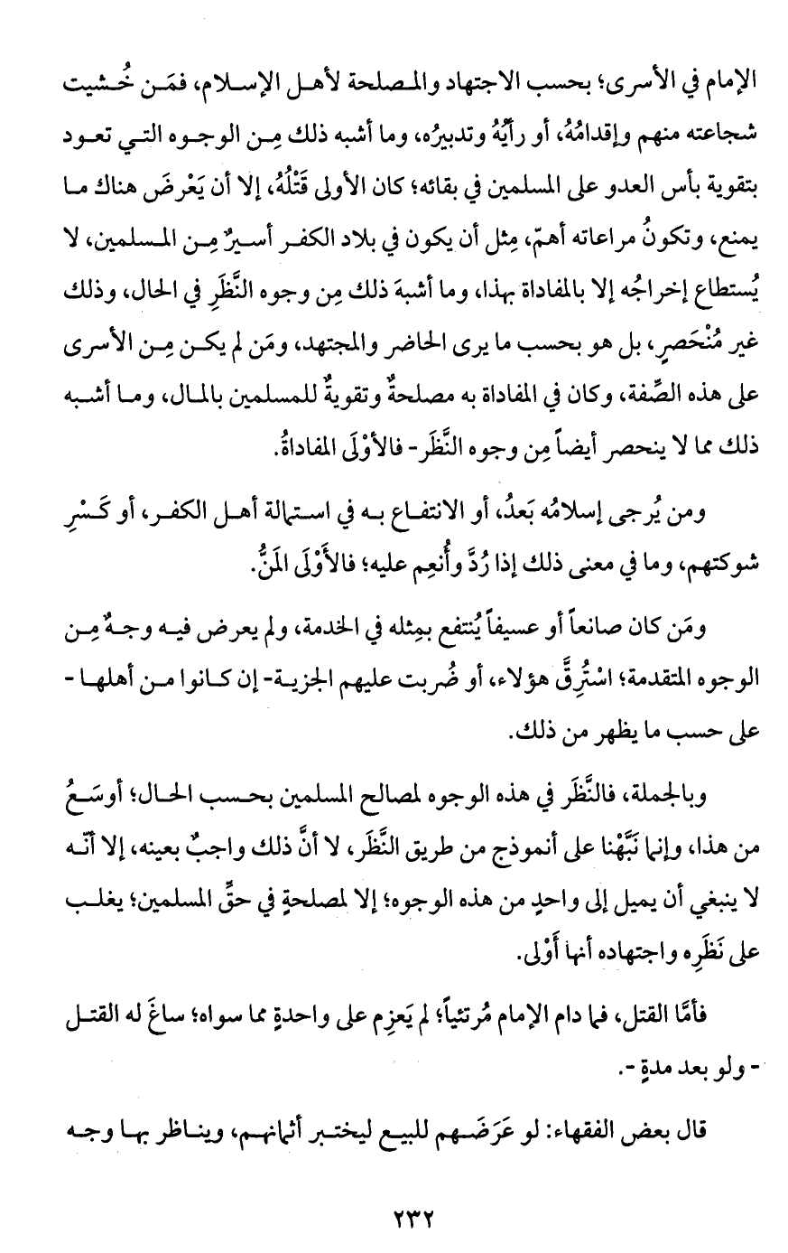 وبالجملة، فالنَّظَر في هذه الوجوه لمصالح المسلمين بحسب الحال؛ أوسَعُ من هذا، وإنما نَبَّهْنا على أنموذج من طريق النَّظَر، لا أنَّ ذلك واجبٌ بعينه، إلاَّ أنّه لا ينبغي أن يميل إلى واحدٍ من هذه الوجوه؛ إلاَّ لمصلحةٍ في حقِّ المسلمين؛ يغلب على نَظَرِه واجتهاده أنهأ أَوْلى.