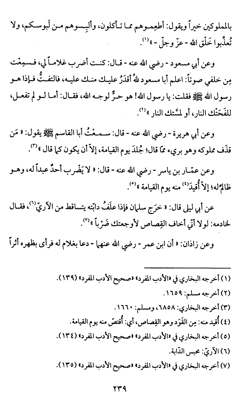 وعن عمّار بن ياسر -رضي الله عنه- قال: "لا يَضْرب أحدٌ عبداً له، وهو ظالمٌ له؛ إلاّ أُقيدَ (¬4) منه يوم القيامة" (¬5).