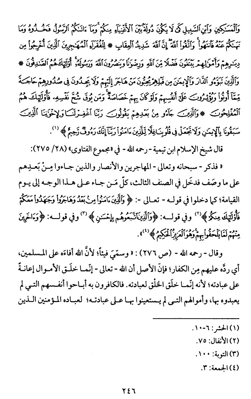 وَالْمَسَاكِينِ وَابْنِ السَّبِيلِ كَيْ لَا يَكُونَ دُولَةً بَيْنَ الْأَغْنِيَاءِ مِنْكُمْ وَمَا آتَاكُمُ الرَّسُولُ فَخُذُوهُ وَمَا نَهَاكُمْ عَنْهُ فَانْتَهُوا وَاتَّقُوا اللَّهَ إِنَّ اللَّهَ شَدِيدُ الْعِقَابِ * لِلْفُقَرَاءِ الْمُهَاجِرِينَ الَّذِينَ أُخْرِجُوا مِنْ دِيَارِهِمْ وَأَمْوَالِهِمْ يَبْتَغُونَ فَضْلًا مِنَ اللَّهِ وَرِضْوَانًا وَيَنْصُرُونَ اللَّهَ وَرَسُولَهُ أُولَئِكَ هُمُ الصَّادِقُونَ * وَالَّذِينَ تَبَوَّءُوا الدَّارَ وَالْإِيمَانَ مِنْ قَبْلِهِمْ يُحِبُّونَ مَنْ هَاجَرَ إِلَيْهِمْ وَلَا يَجِدُونَ فِي صُدُورِهِمْ حَاجَةً مِمَّا أُوتُوا وَيُؤْثِرُونَ عَلَى أَنْفُسِهِمْ وَلَوْ كَانَ بِهِمْ خَصَاصَةٌ وَمَنْ يُوقَ شُحَّ نَفْسِهِ فَأُولَئِكَ هُمُ الْمُفْلِحُونَ * وَالَّذِينَ جَاءُوا مِنْ بَعْدِهِمْ يَقُولُونَ رَبَّنَا اغْفِرْ لَنَا وَلِإِخْوَانِنَا الَّذِينَ سَبَقُونَا بِالْإِيمَانِ وَلَا تَجْعَلْ فِي قُلُوبِنَا غِلًّا لِلَّذِينَ آمَنُوا رَبَّنَا إِنَّكَ رَءُوفٌ رَحِيمٌ} (¬1).