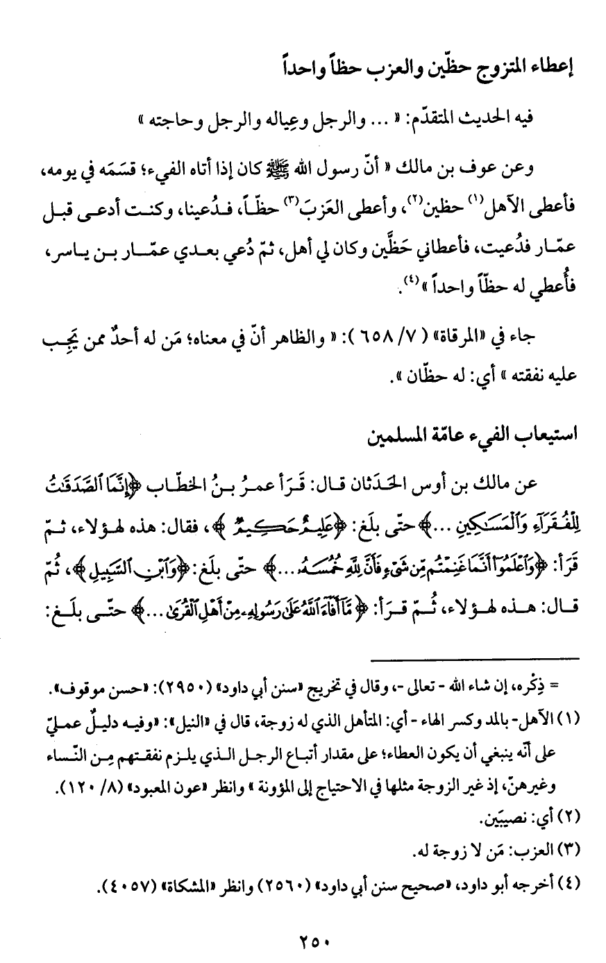 وعن عوف بن مالك "أنّ رسول الله - صَلَّى اللَّهُ عَلَيْهِ وَسَلَّمَ - كان إذا أتاه الفيء؛ قسَمَه في يومه، فأعطى الآهل (¬1) حظين (¬2)، وأعطى العَزبَ (¬3) حظّاً، فدُعينا، وكنت أدعى قبل عمّار فدُعيت، فأعطاني حَظَّين وكان لي أهل، ثمّ دُعي بعدي عمّار بن ياسر، فأُعطي له حظّاً واحداً" (¬4).