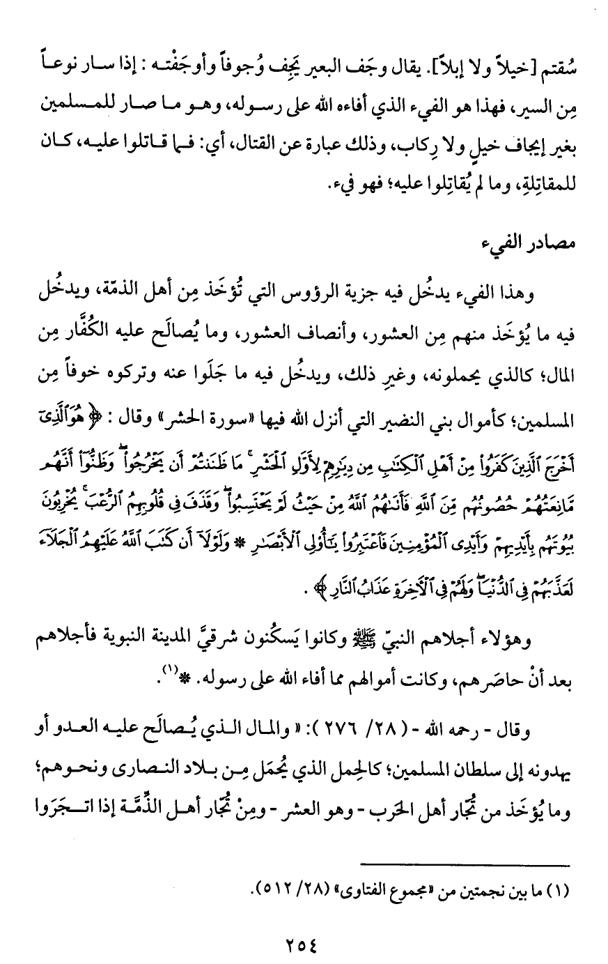 وهذا الفيء يدخُل فيه جزية الرؤوس التي تُؤخَذ مِن أهل الذمّة، ويدخُل فيه ما يُؤخَذ منهم مِن العشور، وأنصاف العشور، وما يُصالَح عليه الكُفَّار مِن المال؛ كالذي يحملونه، وغيرِ ذلك، ويدخُل فيه ما جَلَوا عنه وتركوه خوفاً مِن المسلمين؛ كأموال بني النضير التي أنزل الله فيها "سورة الحشر" وقال: {هُوَ الَّذِي أَخْرَجَ الَّذِينَ كَفَرُوا مِنْ أَهْلِ الْكِتَابِ مِنْ دِيَارِهِمْ لِأَوَّلِ الْحَشْرِ مَا ظَنَنْتُمْ أَنْ يَخْرُجُوا وَظَنُّوا أَنَّهُمْ مَانِعَتُهُمْ حُصُونُهُمْ مِنَ اللَّهِ فَأَتَاهُمُ اللَّهُ مِنْ حَيْثُ لَمْ يَحْتَسِبُوا وَقَذَفَ فِي قُلُوبِهِمُ الرُّعْبَ يُخْرِبُونَ بُيُوتَهُمْ بِأَيْدِيهِمْ وَأَيْدِي الْمُؤْمِنِينَ فَاعْتَبِرُوا يَا أُولِي الْأَبْصَارِ * وَلَوْلَا أَنْ كَتَبَ اللَّهُ عَلَيْهِمُ الْجَلَاءَ لَعَذَّبَهُمْ فِي الدُّنْيَا وَلَهُمْ فِي الْآخِرَةِ عَذَابُ النَّارِ}.