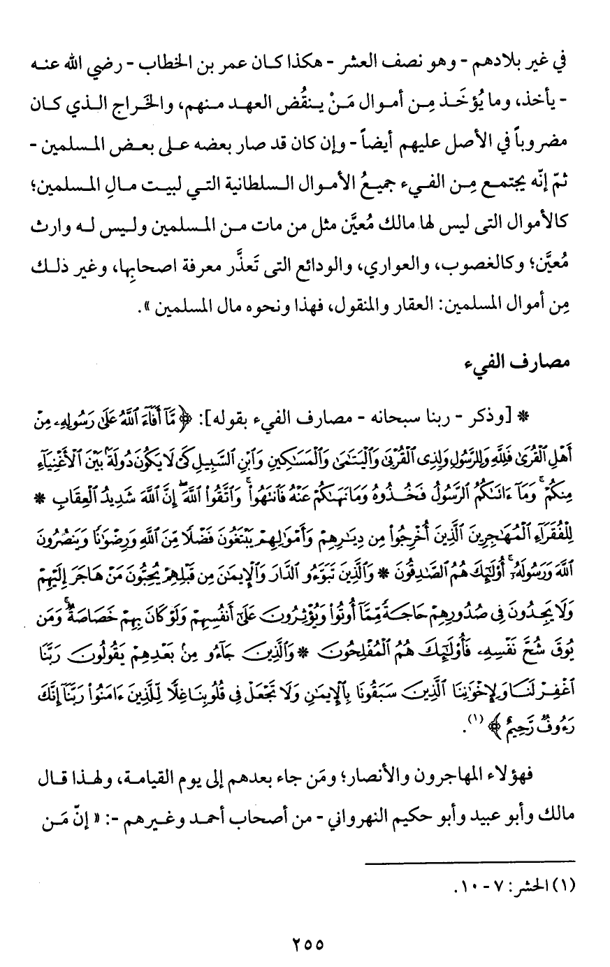 في غير بلادهم -وهو نصف العشر- هكذا كان عمر بن الخطاب -رضي الله عنه - يأخذ، وما يُؤخَذ مِن أموال مَنْ ينقُض العهد منهم، والخَراج الذي كان مضروباً في الأصل عليهم أيضاً -وإن كان قد صار بعضه على بعض المسلمين- ثمّ إنّه يجتمع مِن الفيء جميعُ الأموال السلطانية التي لبيت مالِ المسلمين؛ كالأموال التي ليس لها مالك مُعيَّن مثل من مات من المسلمين وليس له وارث مُعيَّن؛ وكالغصوب، والعواري، والودائع التي تَعذَّر معرفة أصحابِها، وغير ذلك مِن أموال المسلمين: العقار والمنقول، فهذا ونحوه مال المسلمين".