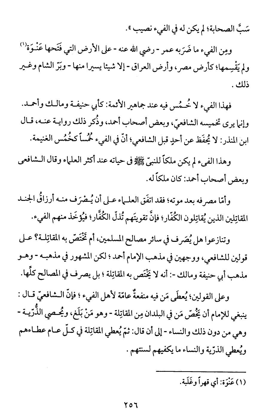 ومِن الفيء ما ضَرَبه عمر -رضي الله عنه- على الأرض التي فتحها عَنْوَة (¬1) ولم يَقْسِمها؛ كأرض مصر، وأرض العراق -إلاَّ شيئا يسيرا منها- وبَرّ الشام وغير ذلك.