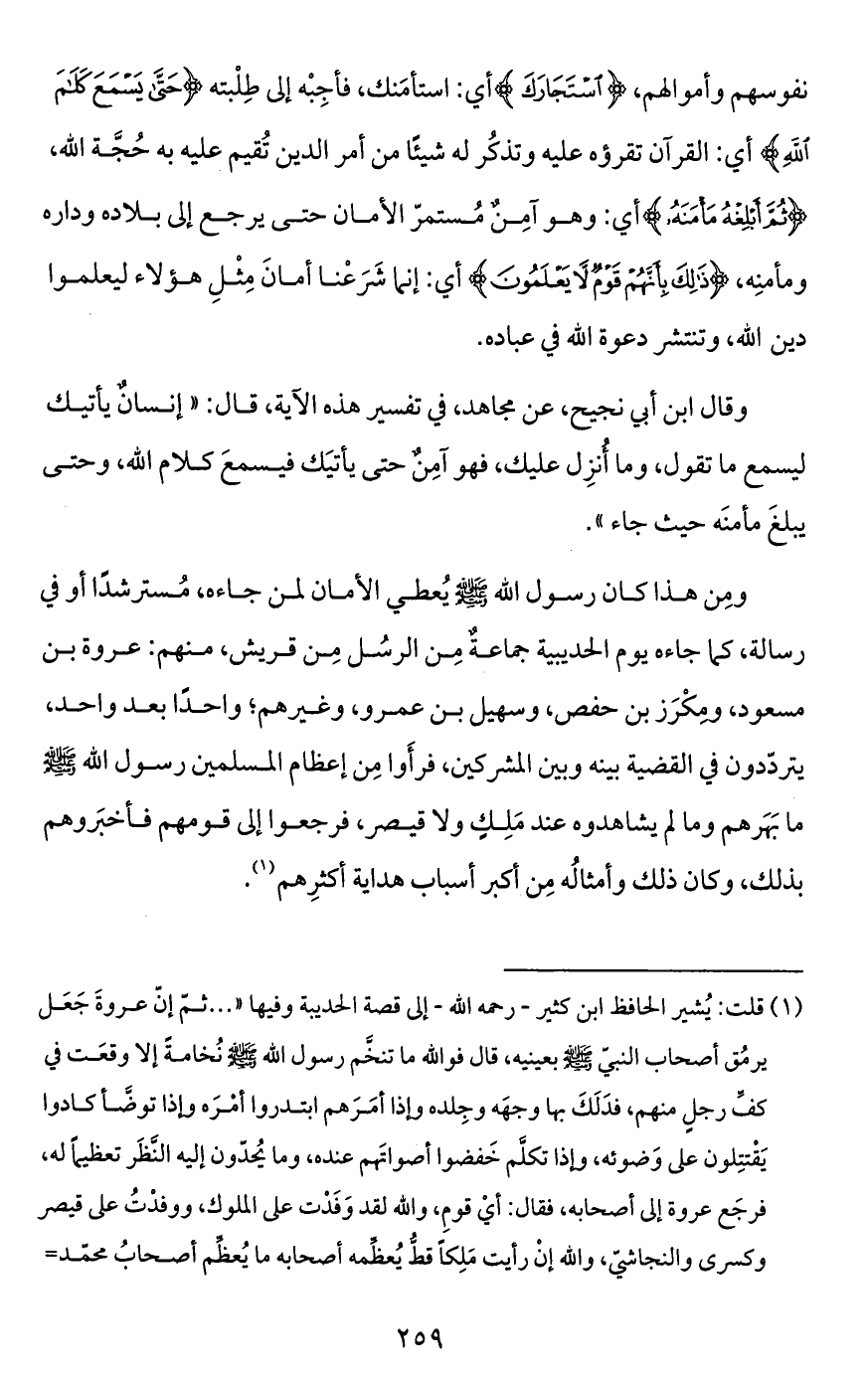 ومِن هذا كان رسول الله - صَلَّى اللَّهُ عَلَيْهِ وَسَلَّمَ - يُعطي الأمان لمن جاءه، مُسترشداً أو في رسالة، كما جاءه يوم الحديبية جماعةٌ مِن الرسُل مِن قريش، منهم: عروة بن مسعود، ومِكْرَز بن حفص، وسهيل بن عمرو، وغيرهم؛ واحداً بعد واحد، يتردّدون في القضية بينه وبين المشركين، فرأَوا مِن إعظام المسلمين رسول الله - صَلَّى اللَّهُ عَلَيْهِ وَسَلَّمَ - ما بَهَرهم وما لم يشاهدوه عند مَلِكٍ ولا قيصر، فرجعوا إلى قومهم فأخبَروهم بذلك، وكان ذلك وأمثالُه مِن أكبر أسباب هداية أكثرِهم (¬1).