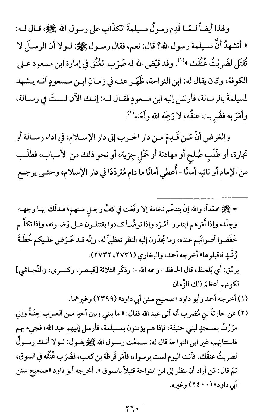 ولهذا أيضاً لمّا قَدِم رسولُ مسيلمةَ الكذّاب على رسول الله - صَلَّى اللَّهُ عَلَيْهِ وَسَلَّمَ -، قال له: "أتشهدُ أنَّ مسيلمة رسول الله؟ قال: نعم، فقال رسول - صَلَّى اللَّهُ عَلَيْهِ وَسَلَّمَ -: لولا أن الرسلَ لا تُقتَل لضَربْتُ عُنُقَك" (¬1). وقد قيّض الله له ضَرْب العُنُق في إمارة ابن مسعود على الكوفة، وكان يقال له: ابن النواحة، ظَهَر عنه في زمانِ ابن مسعودٍ أنّه يشهد لمسيلمةَ بالرسالة، فأرسَل إليه ابن مسعودٍ فقال له: إنك الآن لستَ في رسالة، وأمَرَ به فضُرِبت عنقُه، لا رَحِمَه الله ولَعَنه (¬2).