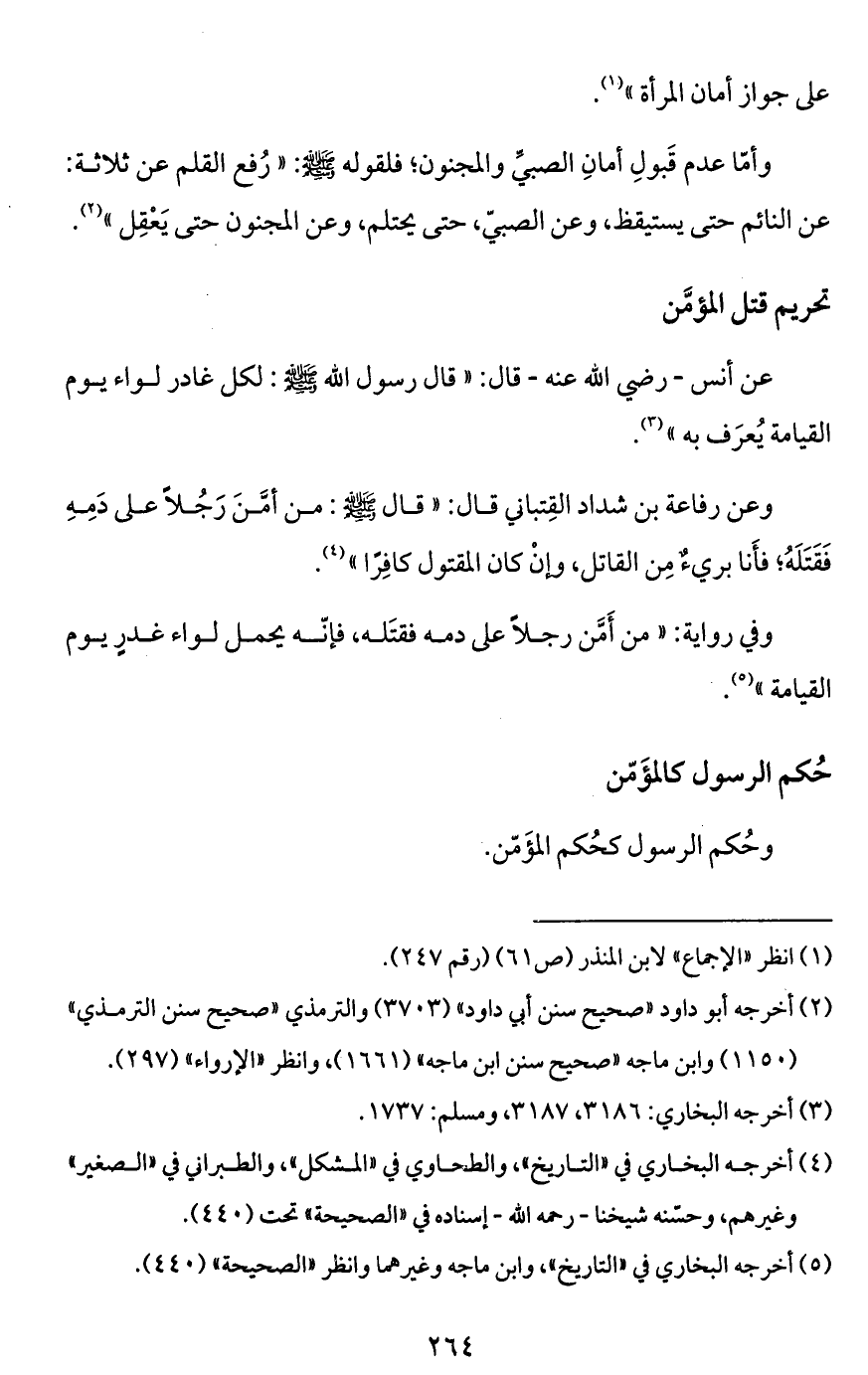 وعن رفاعة بن شداد القِتباني قال: "قال - صَلَّى اللَّهُ عَلَيْهِ وَسَلَّمَ -: من أمَّنَ رَجُلاً على دَمِهِ فَقَتَلَهُ؛ فأَنا بريءٌ مِن القاتل، وإنْ كان المقتول كافِراً" (¬4).