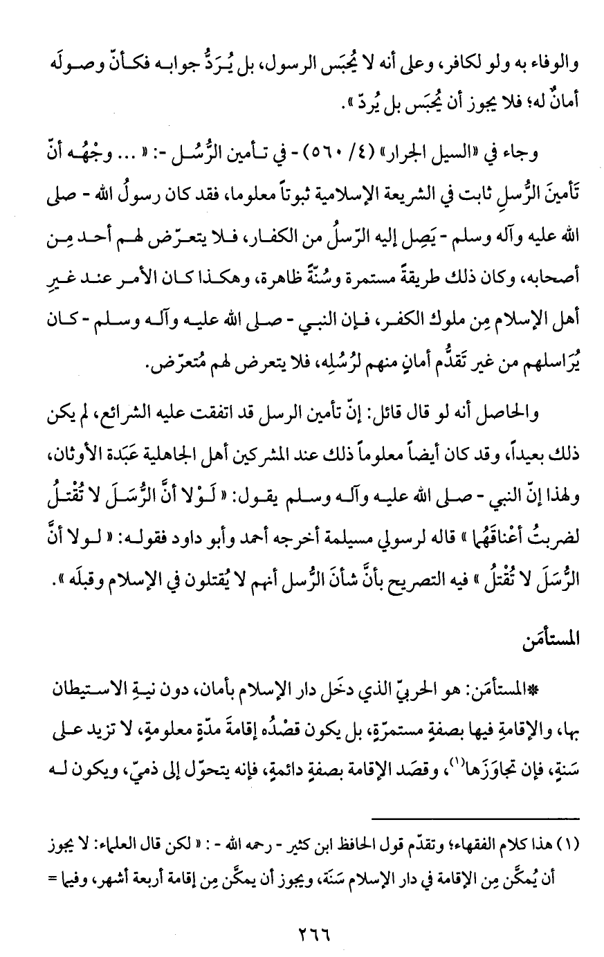 وجاء في "السيل الجرار" (4/ 560) -في تأمين الرُّسُل-: " ... وجْهُه أنّ تَأمينَ الرُّسلِ ثابت في الشريعة الإسلامية ثبوتاً معلوماً، فقد كان رسولُ الله -صلى الله عليه وآله وسلم- يَصِل إليه الرّسلُ من الكفار، فلا يتعرّض لهم أحد مِن أصحابه، وكان ذلك طريقةً مستمرة وسُنّةً ظاهرة، وهكذا كان الأمر عند غيرِ أهل الإسلام مِن ملوك الكفر، فإن النبيّ -صلى الله عليه وآله وسلم- كان يُرَاسلهم من غير تَقدُّم أمانٍ منهم لرُسُلِه، فلا يتعرض لهم مُتعرّض.