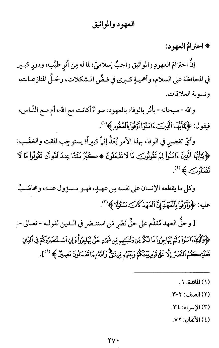 والله -سبحانه- يأمُر بالوفاء بالعهود، سواءٌ أكانت مع الله، أم مع النّاس، فيقول: {يا أيُّهُا الذين آمَنُوَا أَوفُوا بالعُقُودِ} (¬1).