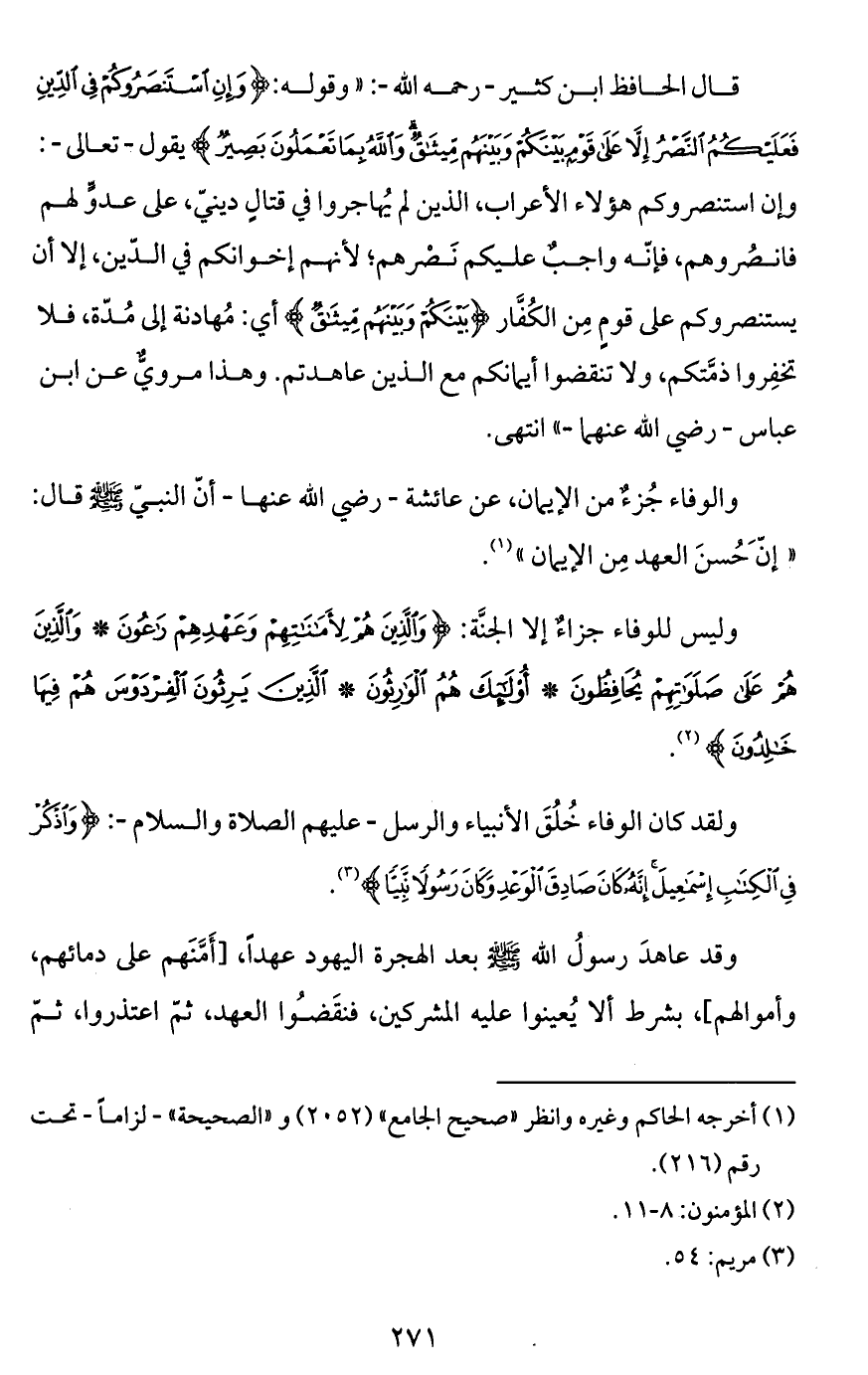 قال الحافظ ابن كثير -رحمه الله-: "وقوله: {وَإِنِ اسْتَنْصَرُوكُمْ فِي الدِّينِ فَعَلَيْكُمُ النَّصْرُ إِلَّا عَلَى قَوْمٍ بَيْنَكُمْ وَبَيْنَهُمْ مِيثَاقٌ وَاللَّهُ بِمَا تَعْمَلُونَ بَصِيرٌ} يقول -تعالى-: وإن استنصروكم هؤلاء الأعراب، الذين لم يُهاجروا في قتالٍ دينيّ، على عدوٍّ لهم فانصُروهم، فإنّه واجبٌ عليكم نَصْرهم؛ لأنهم إخوانكم في الدّين، إلاَّ أن يستنصروكم على قومٍ مِن الكُفَّار {بَيْنَكُمْ وَبَيْنَهُمْ مِيثَاقٌ} أي: مُهادنة إلى مُدّة، فلا تخفِروا ذمَّتكم، ولا تنقضوا أيمانكم مع الذين عاهدتم. وهذا مرويٌّ عن ابن عباس -رضي الله عنهما-" انتهى.