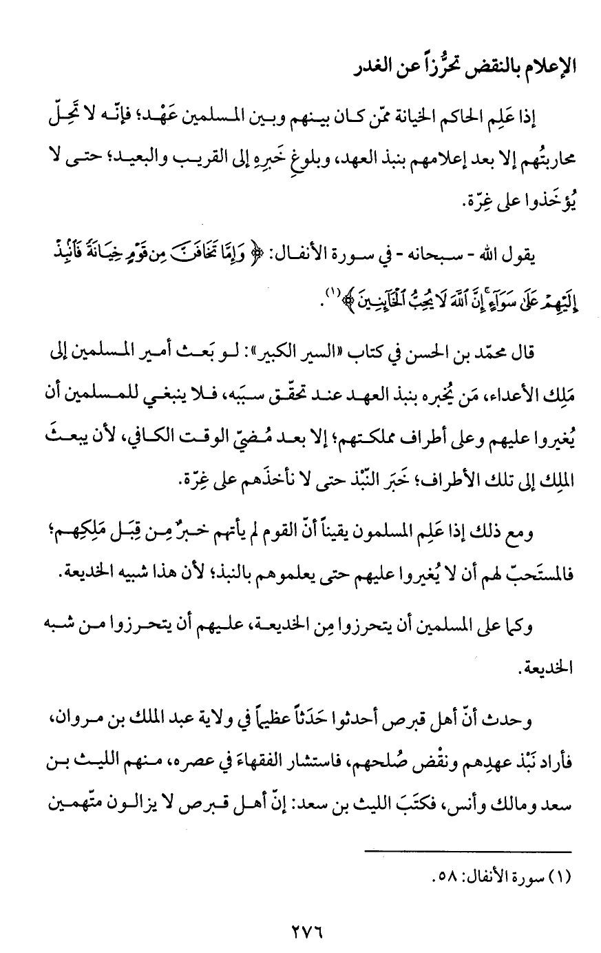 يقول الله- سبحانه- في سورة الأنفال: {وَإِمَّا تَخَافَنَّ مِنْ قَوْمٍ خِيَانَةً فَانْبِذْ إِلَيْهِمْ عَلَى سَوَاءٍ إِنَّ اللَّهَ لَا يُحِبُّ الْخَائِنِينَ} (¬1).