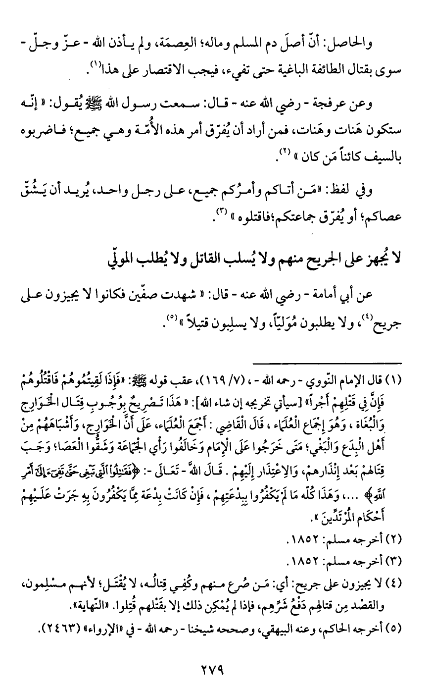 (¬4) لا يجيزون على جريح: أي: مَن صُرع منهم وكُفِي قِتالُه، لا يُقْتَل؛ لأنهم مسْلِمون، والقصْد مِن قتالهِم دَفْعُ شَرِّهِم، فإذا لم يُمْكِن ذلك إلاَّ بقَتْلهم قُتِلوا. "النّهاية".