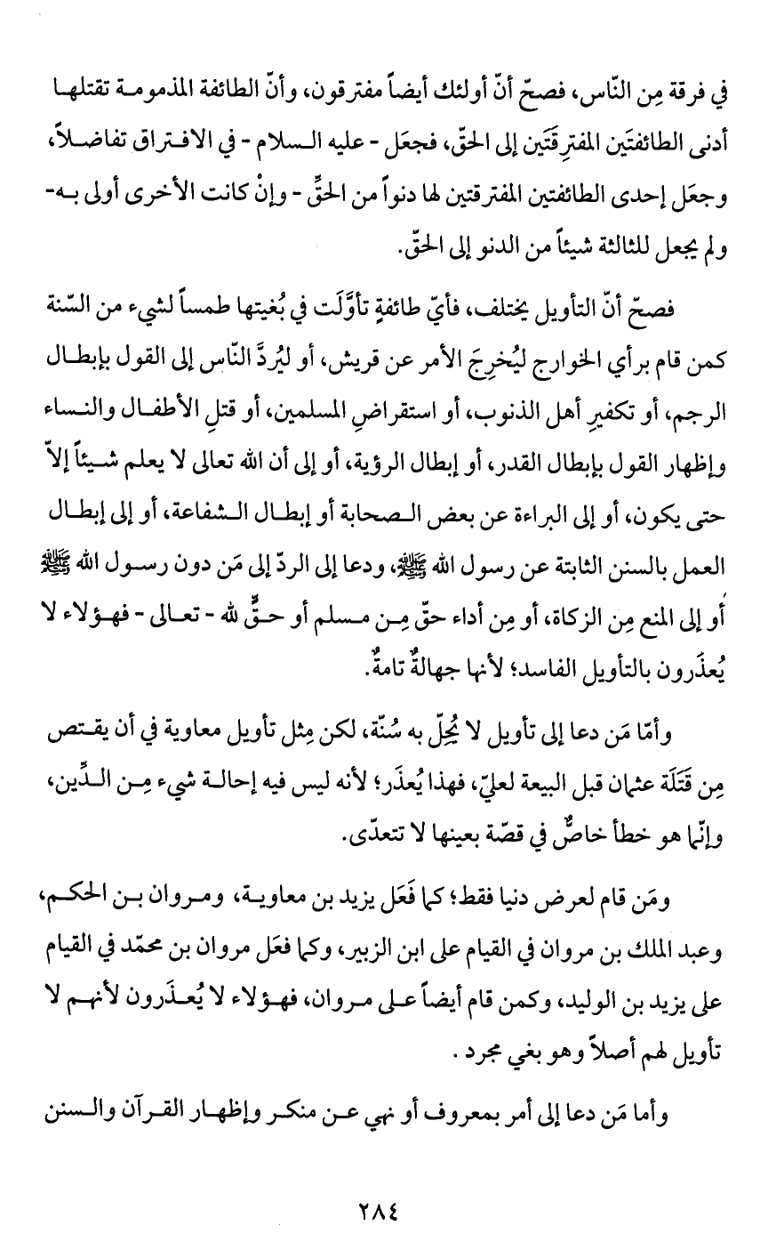 وأمّا مَن دعا إلى تأويل لا يُحِلّ به سُنّة، لكن مِثل تأويل معاوية في أن يقتص مِن قَتَلَة عثمان قبل البيعة لعليّ، فهذا يُعذَر؛ لأنه ليس فيه إحالة شيء مِن الدِّين، وإنّما هو خطأ خاصٌّ في قصّة بعينها لا تتعدّى.