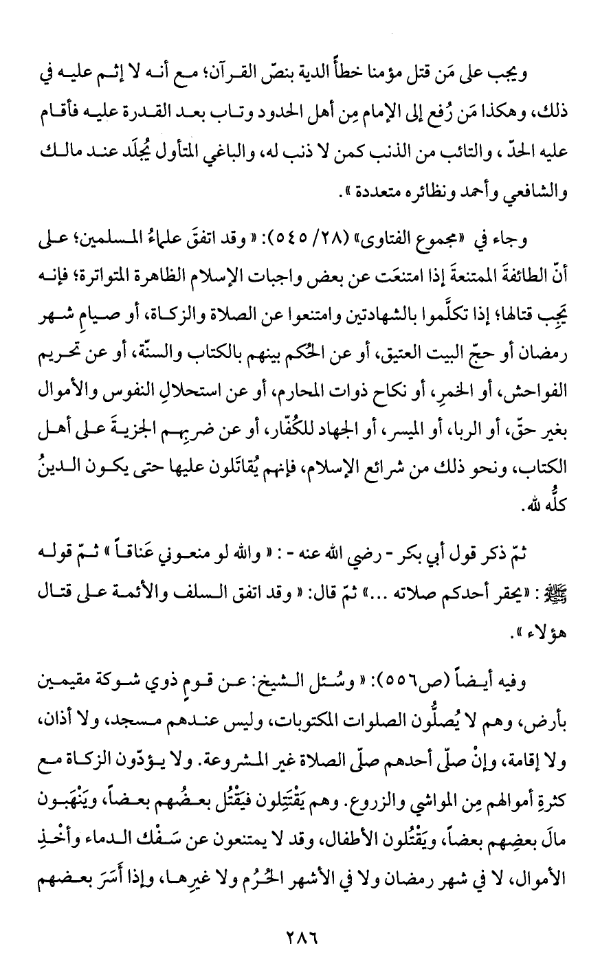 وجاء في "مجموع الفتاوى" (28/ 545): "وقد اتفقَ علماءُ المسلمين؛ على أنّ الطائفةَ الممتنعةَ إذا امتنعَت عن بعض واجبات الإسلام الظاهرة المتواترة؛ فإنه يَجِب قتالها؛ إذا تكلَّموا بالشهادتين وامتنعوا عن الصلاة والزكاة، أو صيامِ شهر رمضان أو حجّ البيت العتيق، أو عن الحُكم بينهم بالكتاب والسنّة، أو عن تحريم الفواحش، أو الخمرِ، أو نكاح ذوات المحارم، أو عن استحلالِ النفوس والأموال بغير حقّ، أو الربا، أو الميمسر، أو الجهاد للكُفّار، أو عن ضربِهم الجزيةَ على أهل الكتاب، ونحو ذلك من شرائع الإسلام، فإنهم يُقاتَلون عليها حتى يكون الدينُ كلُّه لله.