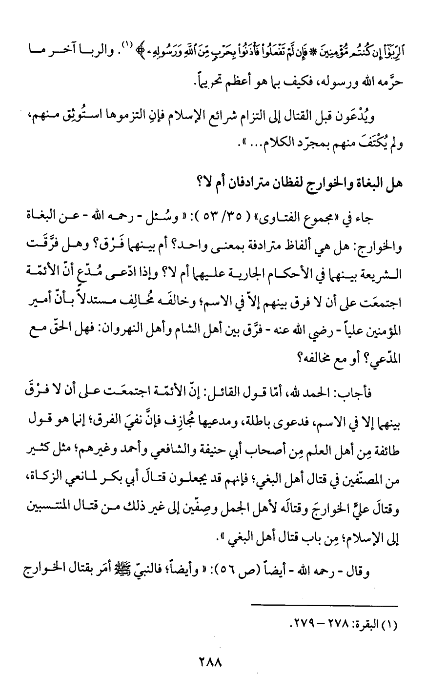 جاء في "مجموع الفتاوى" (35/ 53): "وسُئل -رحمه الله- عن البغاة والخوارج: هل هي ألفاظ مترادفة بمعنى واحد؟ أم بينهما فَرْق؟ وهل فرَّقَت الشريعة بينهما في الأحكام الجارية عليهما أم لا؟ وإذا ادّعى مُدّعٍ أنّ الأئمّة اجتمعَت على أن لا فرق بينهم إلاّ في الاسم؛ وخالفَه مخُالِف مستدلاً بأنّ أمير المؤمنين علياً -رضي الله عنه- فرَّق بين أهل الشام وأهل النهروان: فهل الحقّ مع المدّعي؟ أو مع مخالفه؟