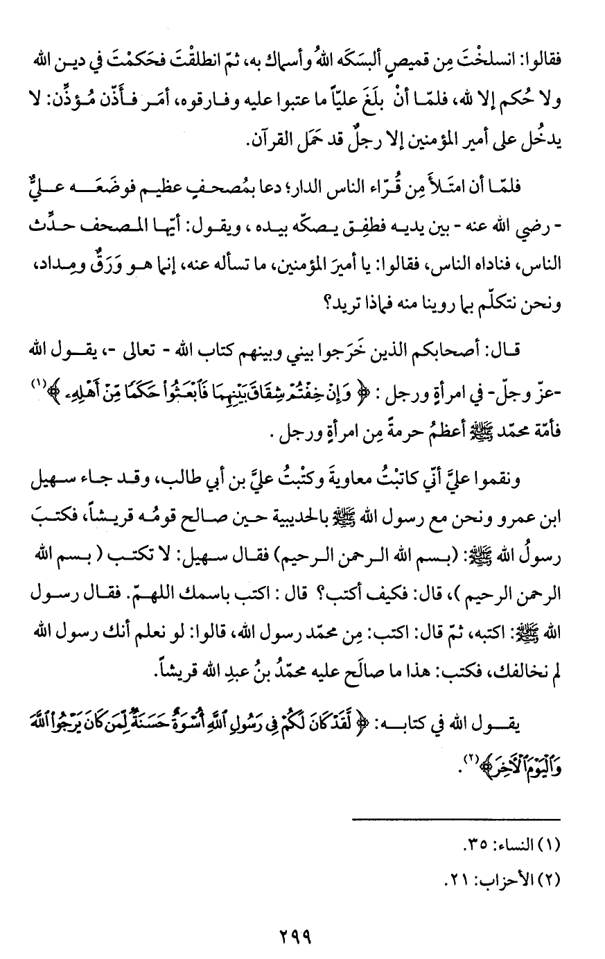 قال: أصحابكم الذين خَرَجوا بيني وبينهم كتاب الله -تعالى-، يقول الله -عزّ وجلّ- في امرأةٍ ورجل: {وإن خفتم شقاق بينهما فابعثوا حكماً من أهله} (¬1) فأمّة محمّد - صَلَّى اللَّهُ عَلَيْهِ وَسَلَّمَ - أعظمُ حرمةً مِن امرأةٍ ورجل.