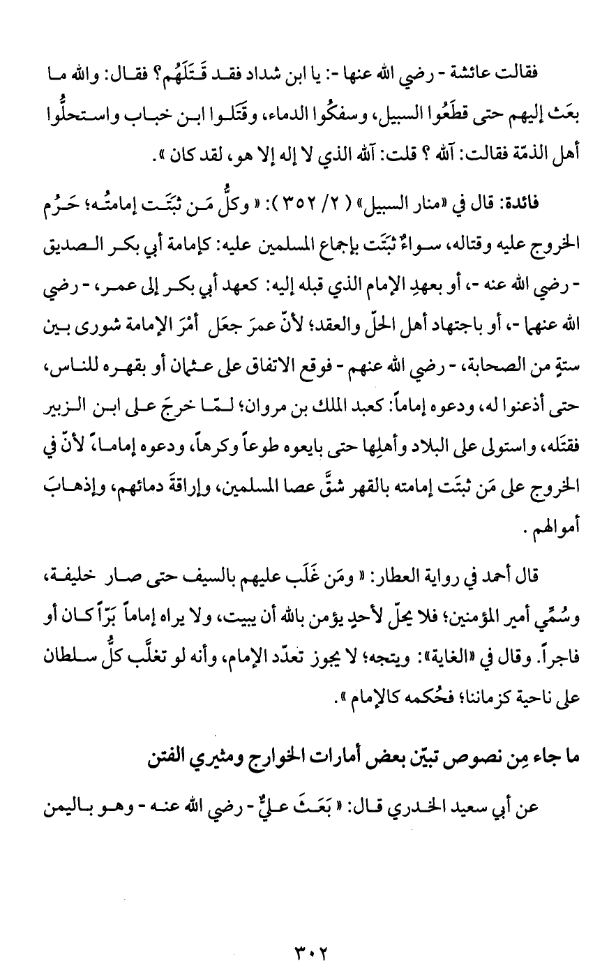 فائدة: قال في "منار السبيل" (2/ 352): "وكلُّ مَن ثبَتَت إمامتُه؛ حَرُم الخروج عليه وقتاله، سواءٌ ثبَتَت بإجماع المسلمين عليه: كإمامة أبي بكر الصديق -رضي الله عنه-، أو بعهدِ الإمام الذي قبله إليه: كعهد أبي بكر إلى عمر، -رضي الله عنهما-، أو باجتهاد أهل الحلّ والعقد؛ لأنّ عمرَ جعَل أمْرَ الإمامة شورى بين ستةٍ من الصحابة، -رضي الله عنهم- فوقع الاتفاق على عثمان أو بقهره للناس، حتى أذعنوا له، ودعوه إماماً: كعبد الملك بن مروان؛ لمّا خرجَ علي ابن الزبير فقتَله، واستولى على البلاد وأهلِها حتى بايعوه طوعاً وكرهاً، ودعوه إماماً، لأنّ في الخروج على مَن ثبتَت إمامته بالقهر شقَّ عصا المسلمين، وإراقةَ دمائهم، وإذهابَ أموالهم.
