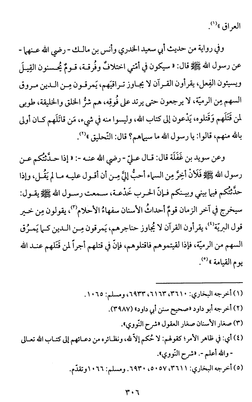 وفي رواية من حديث أبي سعيد الخدري وأنس بن مالك -رضي الله عنهما- عن رسول الله - صَلَّى اللَّهُ عَلَيْهِ وَسَلَّمَ - قال: "سيكون في أمّتي اختلافٌ وفُرقة، قومٌ يُحسنون القِيلَ ويسيئون الفِعل، يقرأون القرآن لا يجاوز تراقيَهم، يَمرقون مِن الدين مروق السهم مِن الرميّة، لا يرجعون حتى يرتد على فُوقِه، هم شرُّ الخلق والخليقة، طوبى لمن قَتَلَهم وَقَتلوه، يَدْعون إلى كتاب الله، وليسوا منه في شيء، مَن قاتَلَهم كان أولى بالله منهم، قالوا: يا رسول الله ما سيماهم؟ قال: التّحليق" (¬2).