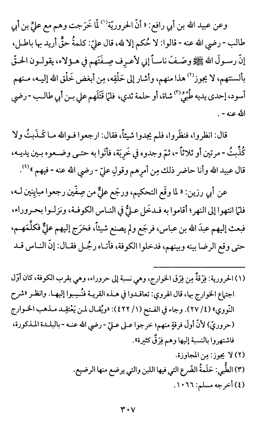 (¬1) الحرورية: فِرْقةٌ مِن فِرَق الخوارج، وهي نسبة إلى حروراء، وهي بقرب الكوفة، كان أوّل اجتماع الخوارج بها، قال الهروي: تعاقدوا في هذه القرية فنُسِبوا إليها. وانظر "شرح النّووي" (4/ 27). وجاء في الفتح (1/ 422): "ويُقال لمن يَعْتقِد مذهب الخوارج (حروريّ) لأن أولَ فرقةٍ منهم؛ خرجوا على عليّ -رضي الله عنه- بالبلدة المذكورة، فاشتهروا بالنسبة إليها وهم فِرَقٌ كثيرة".