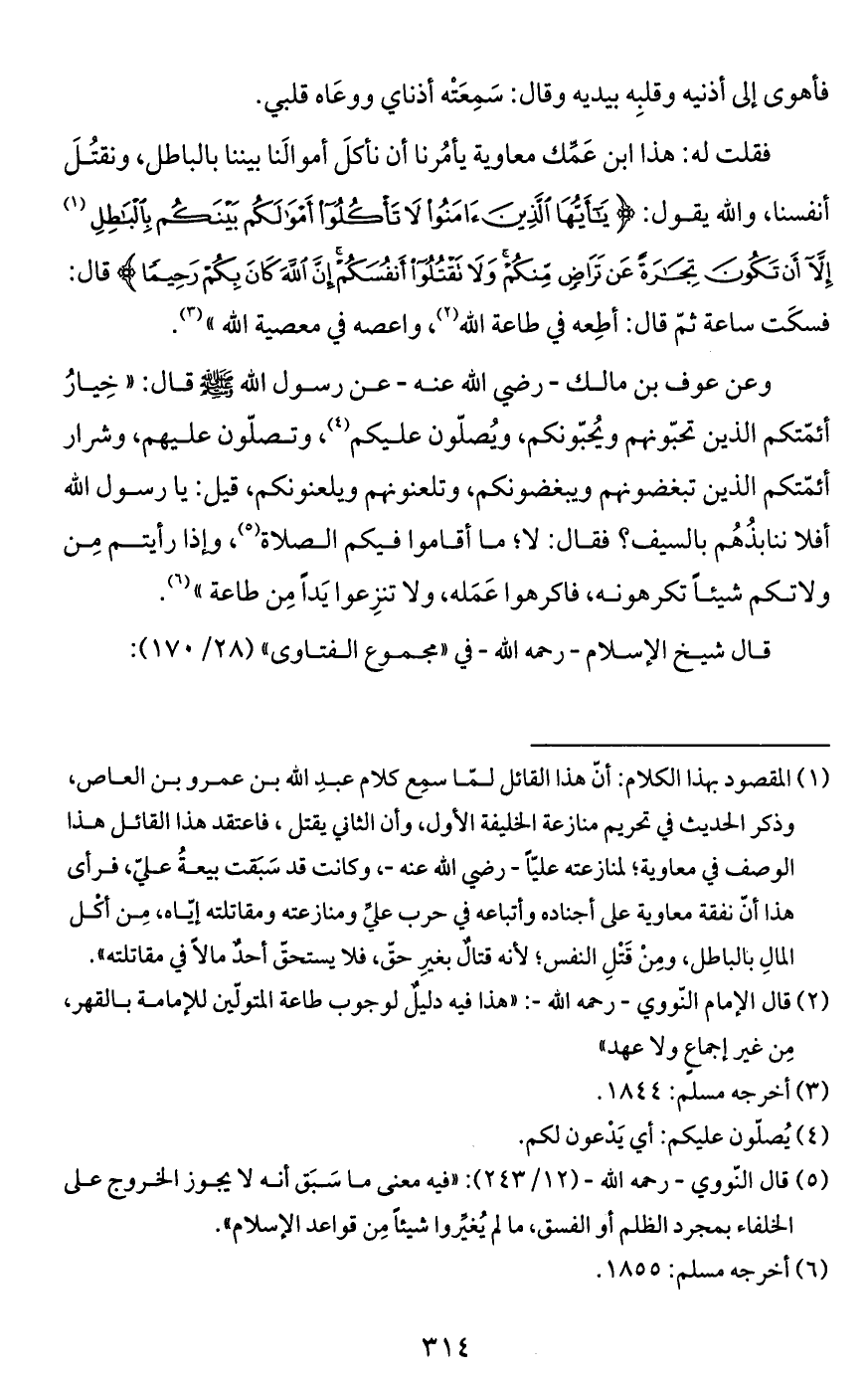 (¬1) المقصود بهذا الكلام: أنّ هذا القائل لمّا سمِع كلام عبدِ الله بن عمرو بن العاص، وذكر الحديث في تحريم منازعة الخليفة الأول، وأن الثاني يقتل، فاعتقد هذا القائل هذا الوصف في معاوية؛ لمنازعته عليّاً -رضي الله عنه-، وكانت قد سَبَقت بيعةُ عليّ، فرأى هذا أنّ نفقة معاوية على أجناده وأتباعه في حرب عليِّ ومنازعته ومقاتلته إياه، مِن أكْل المالِ بالباطل، ومِنْ قَتْلِ النفس؛ لأنه قتالٌ بغيرِ حقّ، فلا يستحقّ أحدٌ مالاً في مقاتلته".