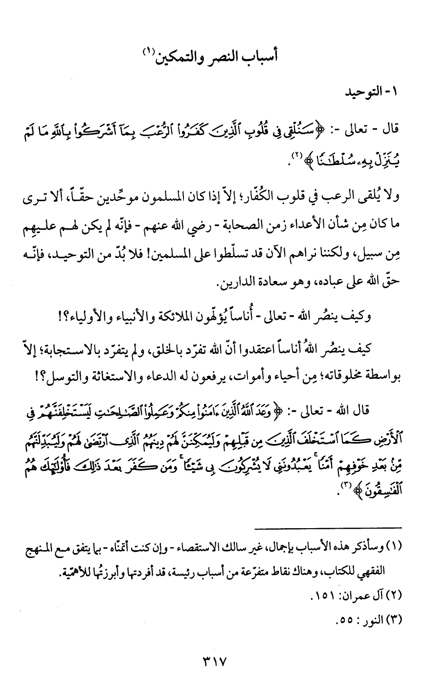 قال الله -تعالى-: {وَعَدَ اللَّهُ الَّذِينَ آمَنُوا مِنْكُمْ وَعَمِلُوا الصَّالِحَاتِ لَيَسْتَخْلِفَنَّهُمْ فِي الْأَرْضِ كَمَا اسْتَخْلَفَ الَّذِينَ مِنْ قَبْلِهِمْ وَلَيُمَكِّنَنَّ لَهُمْ دِينَهُمُ الَّذِي ارْتَضَى لَهُمْ وَلَيُبَدِّلَنَّهُمْ مِنْ بَعْدِ خَوْفِهِمْ أَمْنًا يَعْبُدُونَنِي لَا يُشْرِكُونَ بِي شَيْئًا وَمَنْ كَفَرَ بَعْدَ ذَلِكَ فَأُولَئِكَ هُمُ الْفَاسِقُونَ} (¬3).