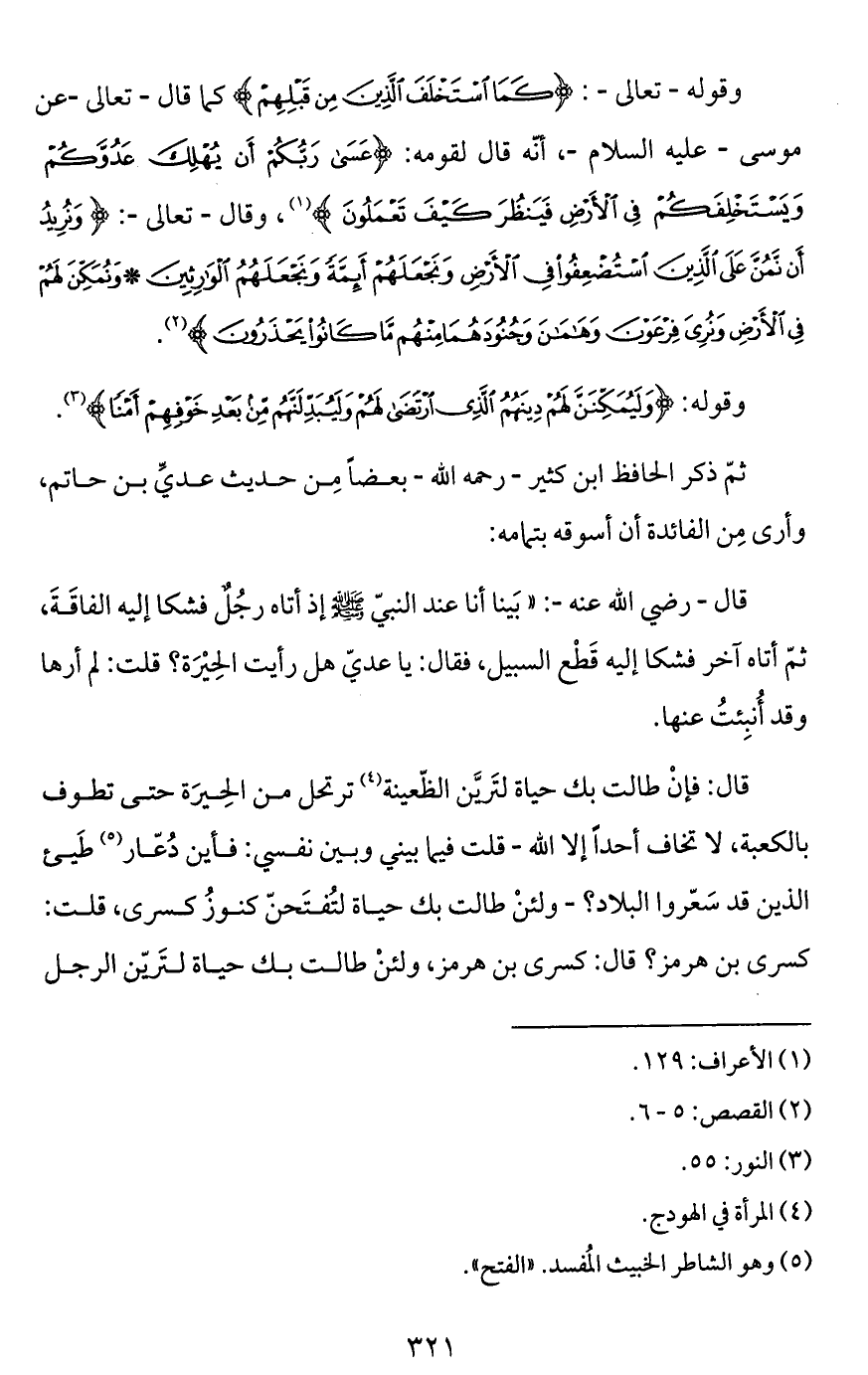 وقوله -تعالى-: {كما استخلف الذين من قبلهم} كما قال -تعالى- عن موسى -عليه السلام-، أنّه قال لقومه: {عَسَى رَبُّكُمْ أَنْ يُهْلِكَ عَدُوَّكُمْ وَيَسْتَخْلِفَكُمْ فِي الْأَرْضِ فَيَنْظُرَ كَيْفَ تَعْمَلُونَ} (¬1)، وقال -تعالى-: {وَنُرِيدُ أَنْ نَمُنَّ عَلَى الَّذِينَ اسْتُضْعِفُوا فِي الْأَرْضِ وَنَجْعَلَهُمْ أَئِمَّةً وَنَجْعَلَهُمُ الْوَارِثِينَ * وَنُمَكِّنَ لَهُمْ فِي الْأَرْضِ وَنُرِيَ فِرْعَوْنَ وَهَامَانَ وَجُنُودَهُمَا مِنْهُمْ مَا كَانُوا يَحْذَرُونَ} (¬2).