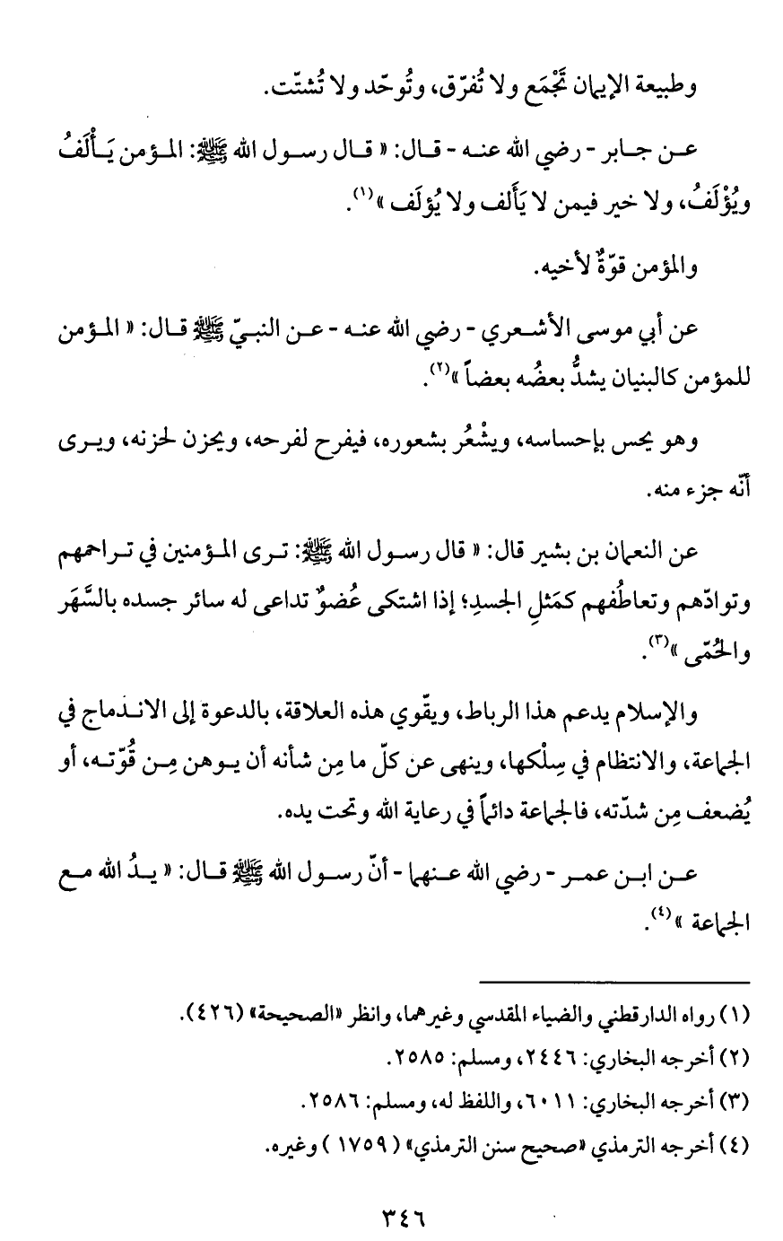 عن النعمان بن بشير قال: "قال رسول الله - صَلَّى اللَّهُ عَلَيْهِ وَسَلَّمَ -: ترى المؤمنين في تراحمهم وتوادّهم وتعاطُفهم كمَثلِ الجسدِ؛ إذا اشتكى عُضوٌ تداعى له سائر جسده بالسَّهَر والحُمّى" (¬3).