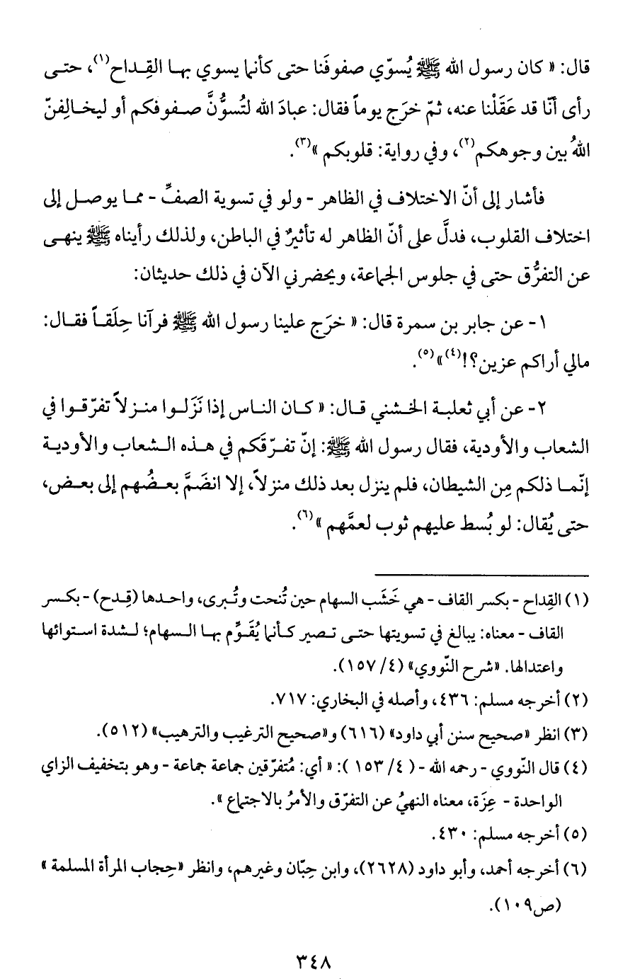 فأشار إلى أنّ الاختلاف في الظاهر -ولو في تسوية الصفِّ- مما يوصل إلى اختلاف القلوب، فدلَّ على أنّ الظاهر له تأثيرٌ في الباطن، ولذلك رأيناه - صَلَّى اللَّهُ عَلَيْهِ وَسَلَّمَ - ينهى عن التفرُّق حتى في جلوس الجماعة، ويحضرني الآن في ذلك حديثان:
